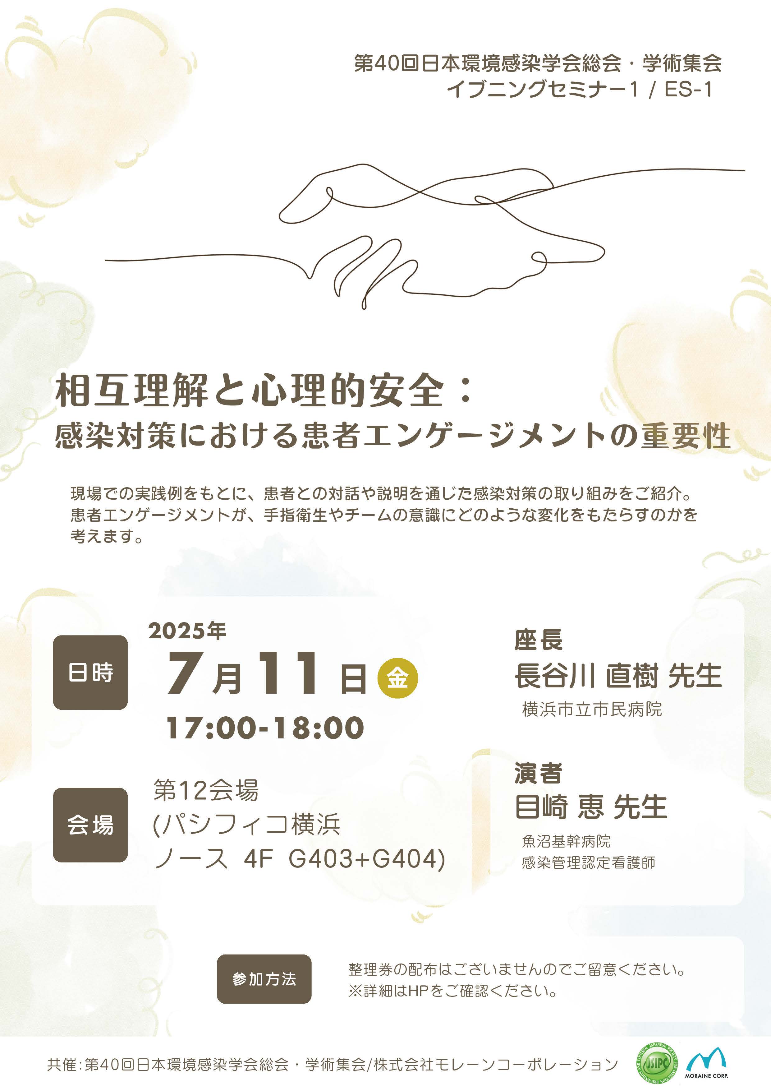イブニングセミナー1 相互理解と心理的安全:感染対策における患者エンゲージメントの重要性 2025年7月11日(金) 17:00 - 18:00 第12会場 | ノース 4F G403+G404 共催:株式会社モレーンコーポレーション |