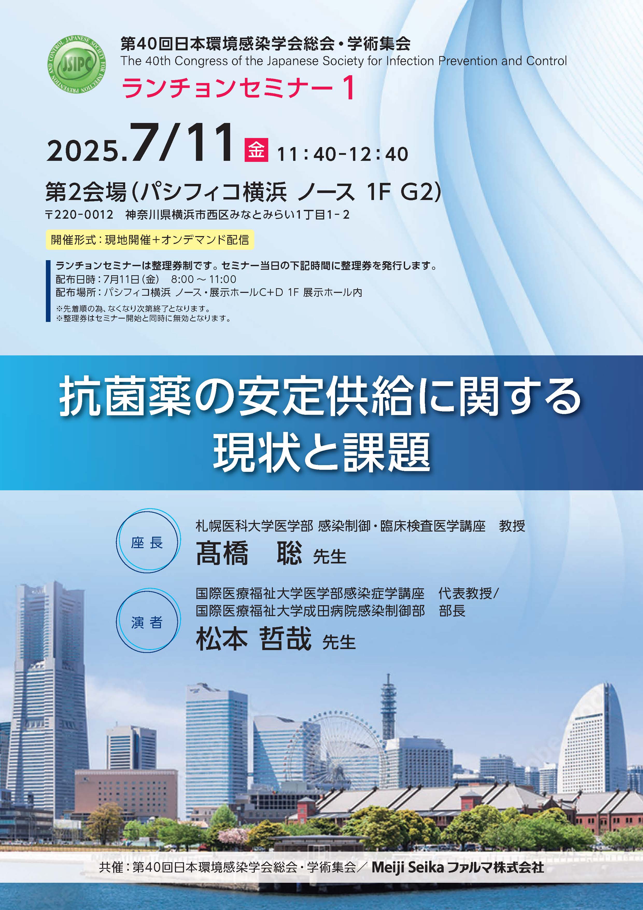 ランチョンセミナー1 抗菌薬の安定供給に関する現状と課題 2025年7月11日(金) 11:40 - 12:40 第2会場 | ノース 1F G2 共催:Meiji Seika ファルマ株式会社 |