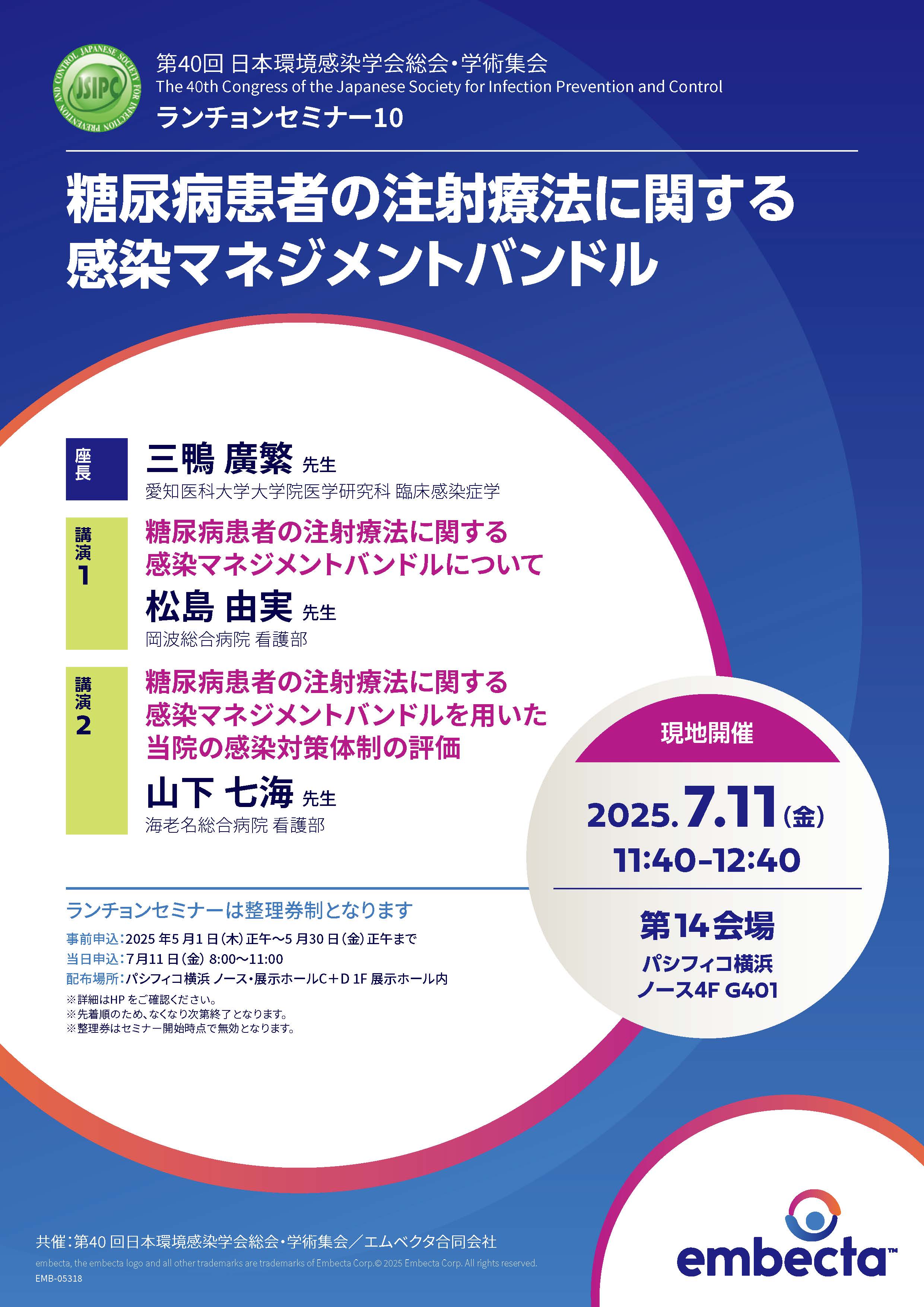 ランチョンセミナー10 糖尿病患者の注射療法に関する感染マネジメントバンドル 2025年7月11日(金) 11:40 - 12:40 第14会場 | ノース 4F G401 共催:エムベクタ合同会社 |
