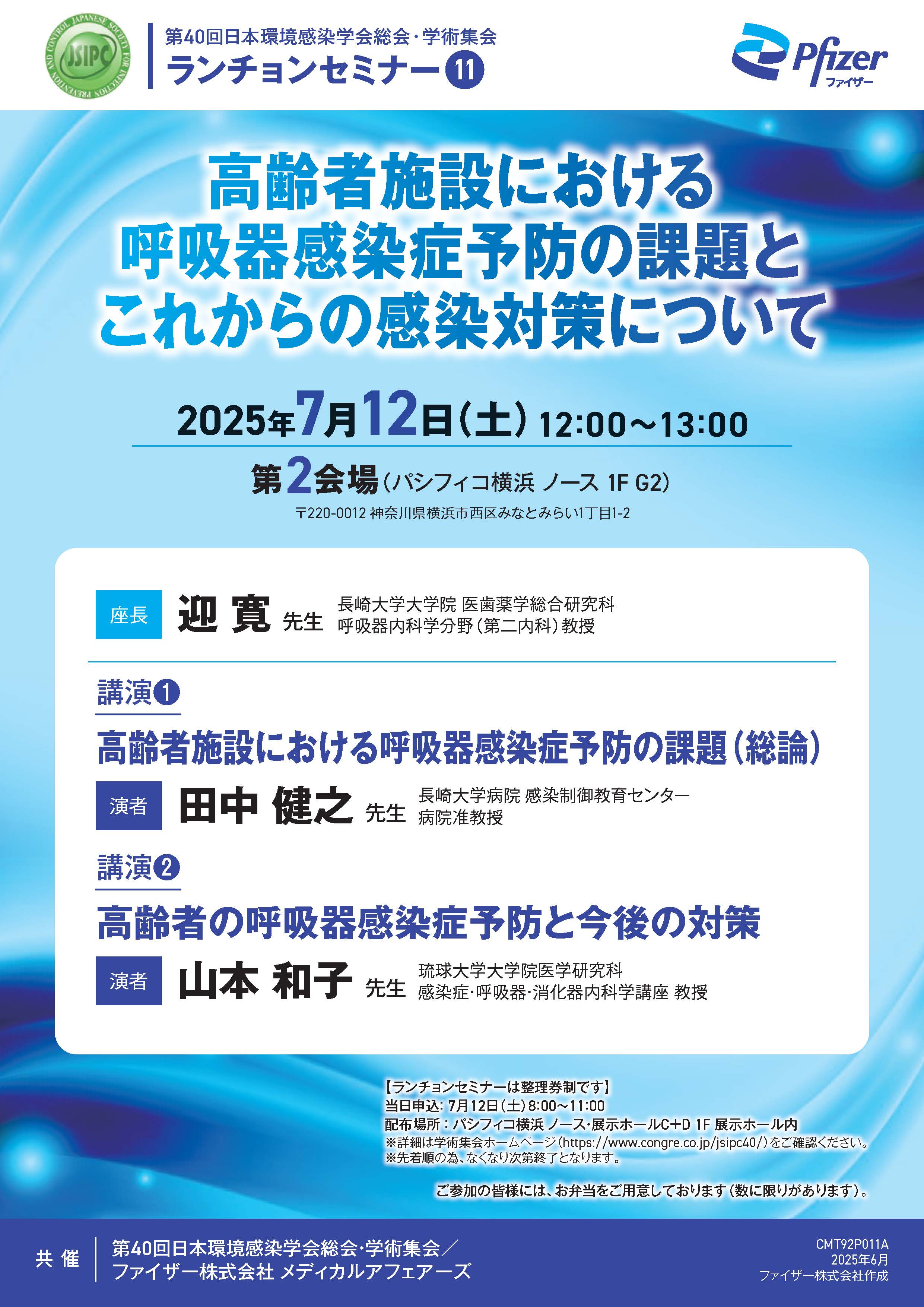 ランチョンセミナー11 高齢者施設における呼吸器感染症予防の課題とこれからの感染対策について 2025年7月12日(土) 12:00 - 13:00 第2会場 | ノース 1F G2 共催:ファイザー株式会社 メディカルアフェアーズ |