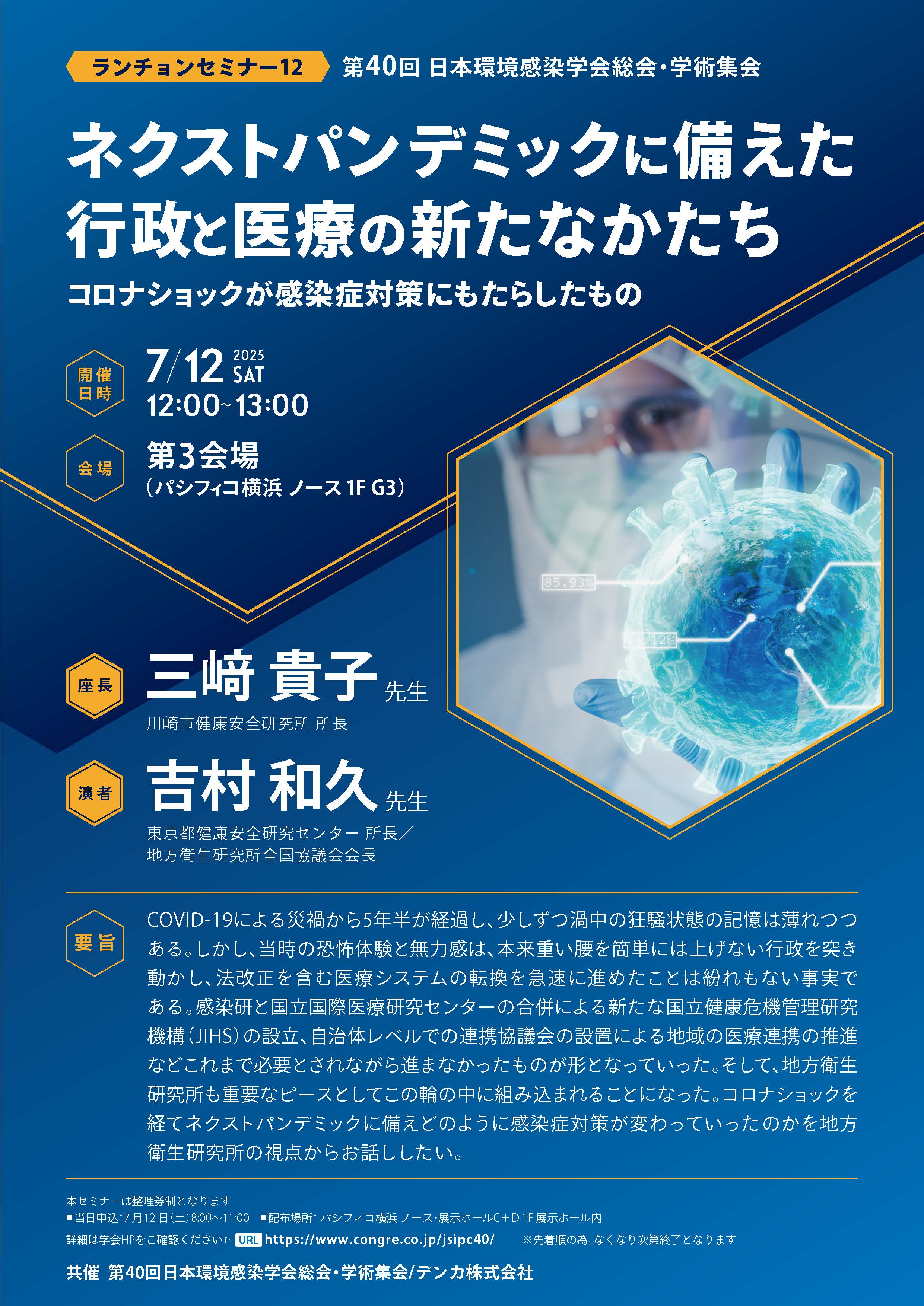 ランチョンセミナー12 ネクストパンデミックに備えた行政と医療の新たなかたち~コロナショックが感染症対策にもたらしたもの~ 2025年7月12日(土) 12:00 - 13:00 第3会場 | ノース 1F G3 共催:デンカ株式会社 |