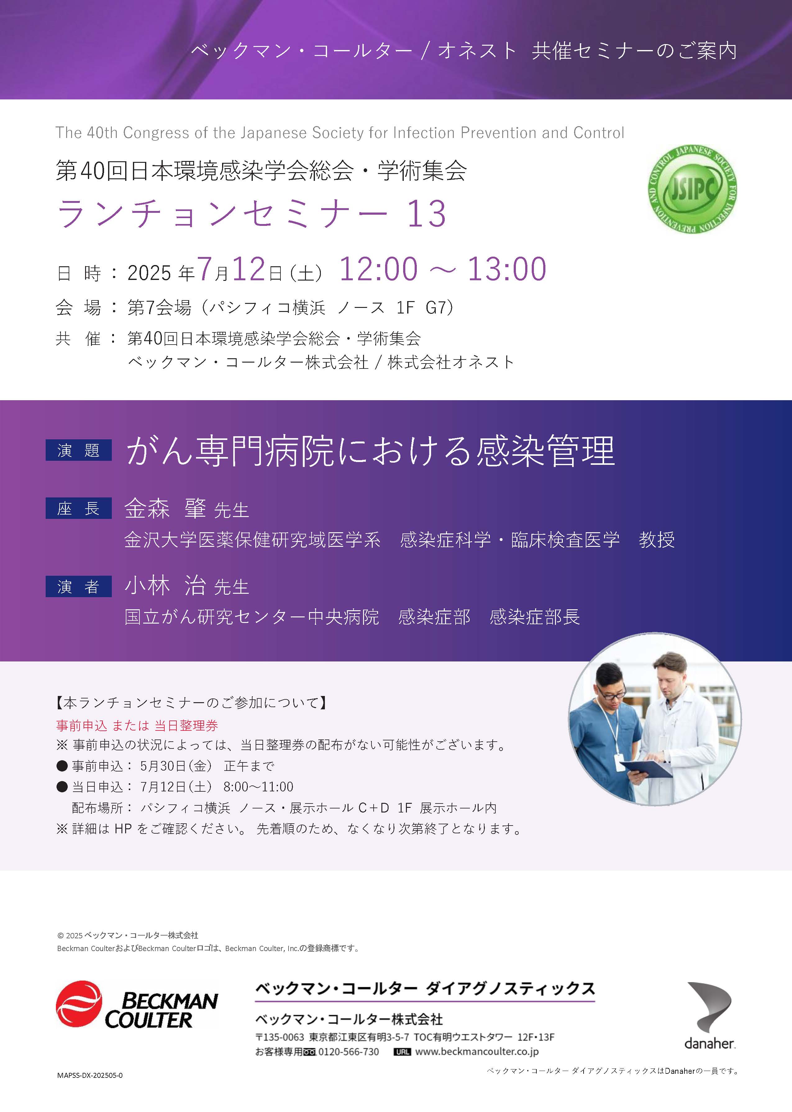 ランチョンセミナー13 がん専門病院における感染管理 2025年7月12日(土) 12:00 - 13:00 第7会場 | ノース 1F G7 共催:ベックマン・コールター株式会社/株式会社オネスト |