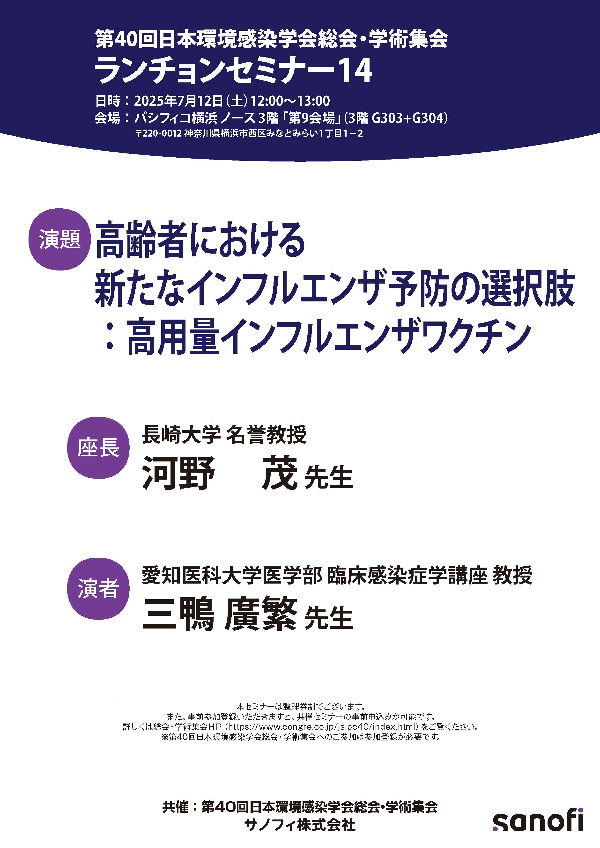 ランチョンセミナー14 高齢者における新たなインフルエンザ予防の選択肢:高用量インフルエンザワクチン 2025年7月12日(土) 12:00 - 13:00 第9会場 | ノース 3F G303+G304 共催:サノフィ株式会社 |