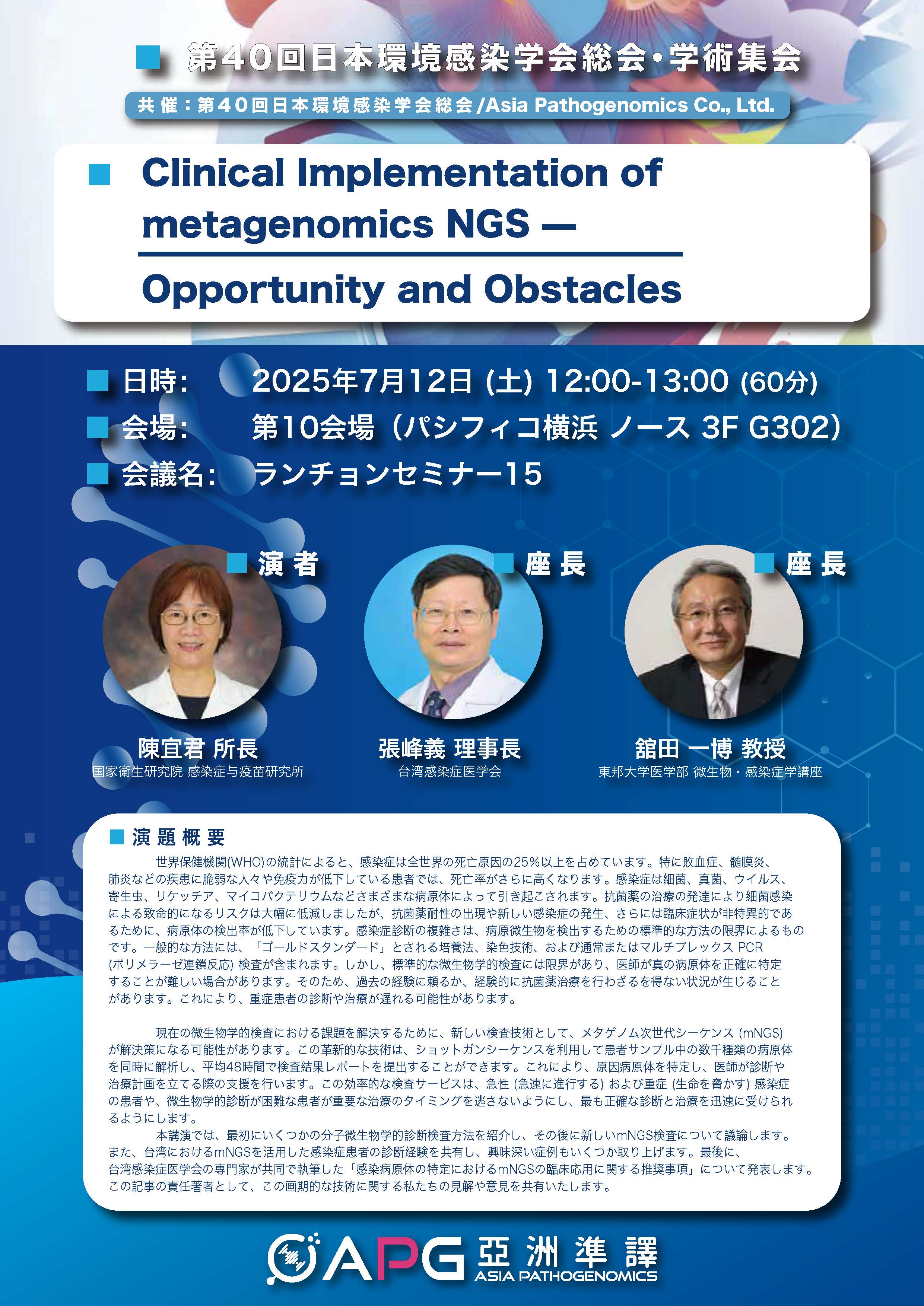 ランチョンセミナー15 Clinical implementation of metagenomic NGS - opportunity and obstacles 2025年7月12日(土) 12:00 - 13:00 第10会場 | ノース 3F G302 共催:Asia Pathogenomics Co., Ltd. |