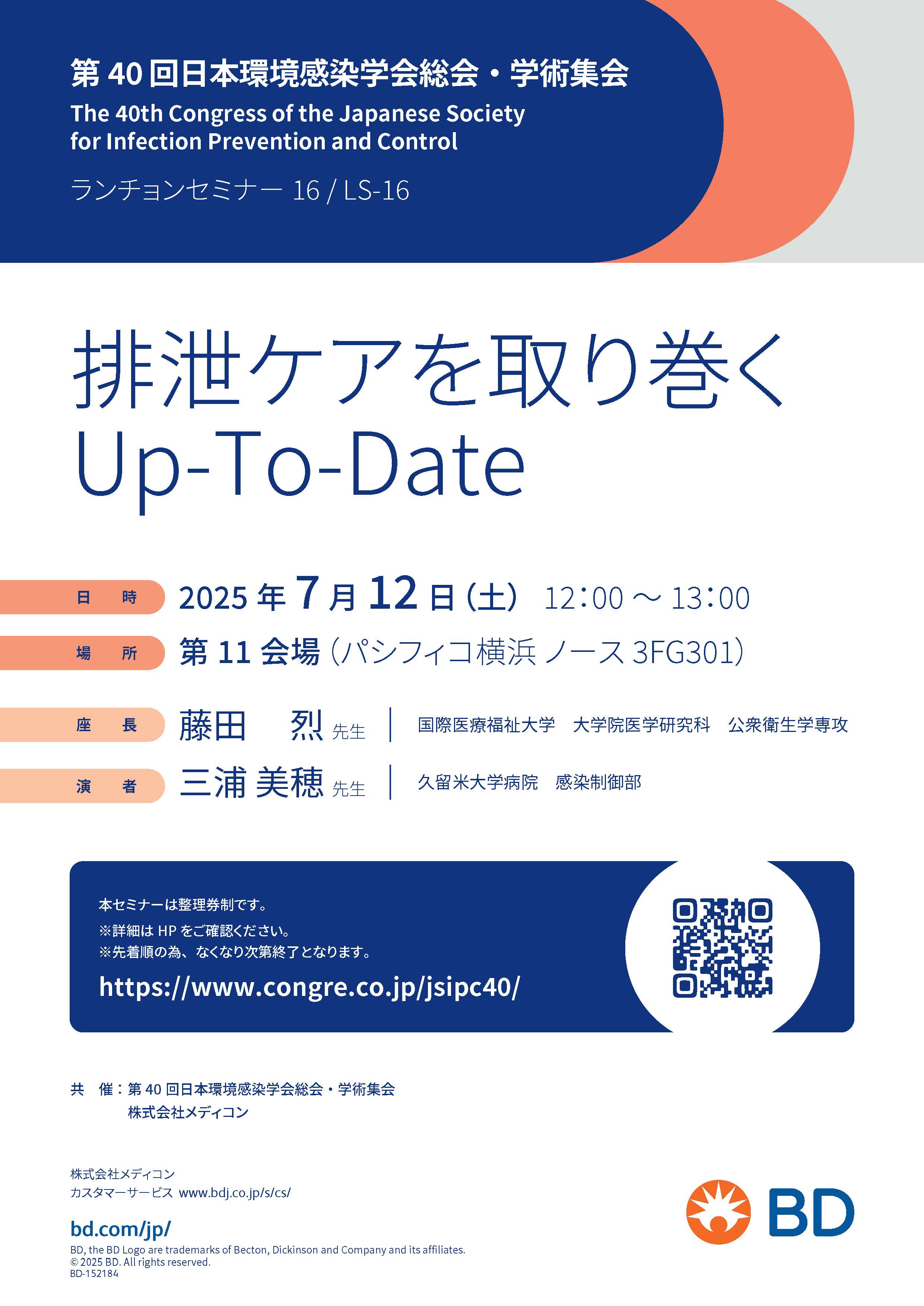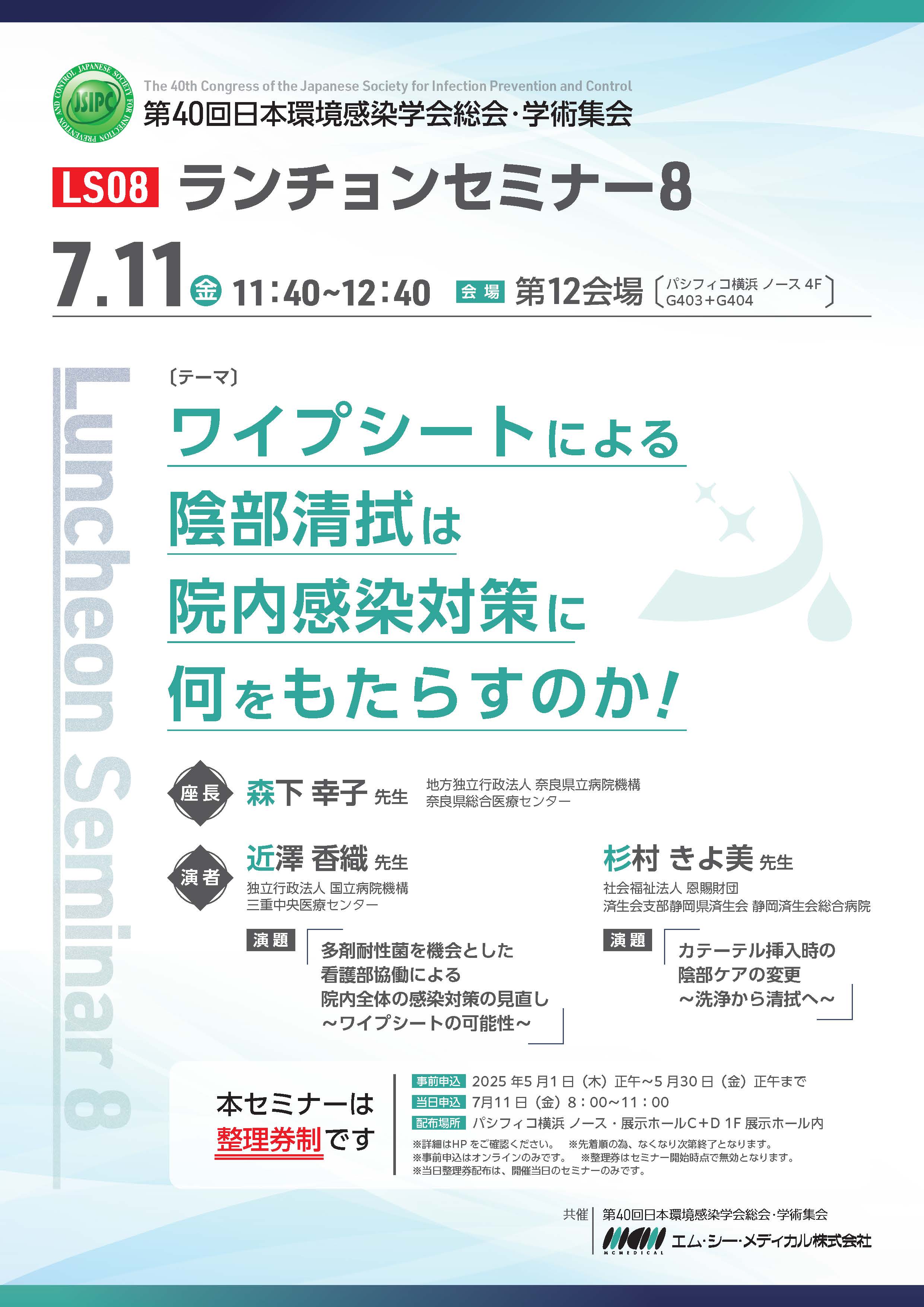 ランチョンセミナー8 ワイプシートによる陰部清拭は院内感染対策に何をもたらすのか! 2025年7月11日(金) 11:40 - 12:40 第12会場 | ノース 4F G403+G404 共催:エム・シー・メディカル株式会社 |