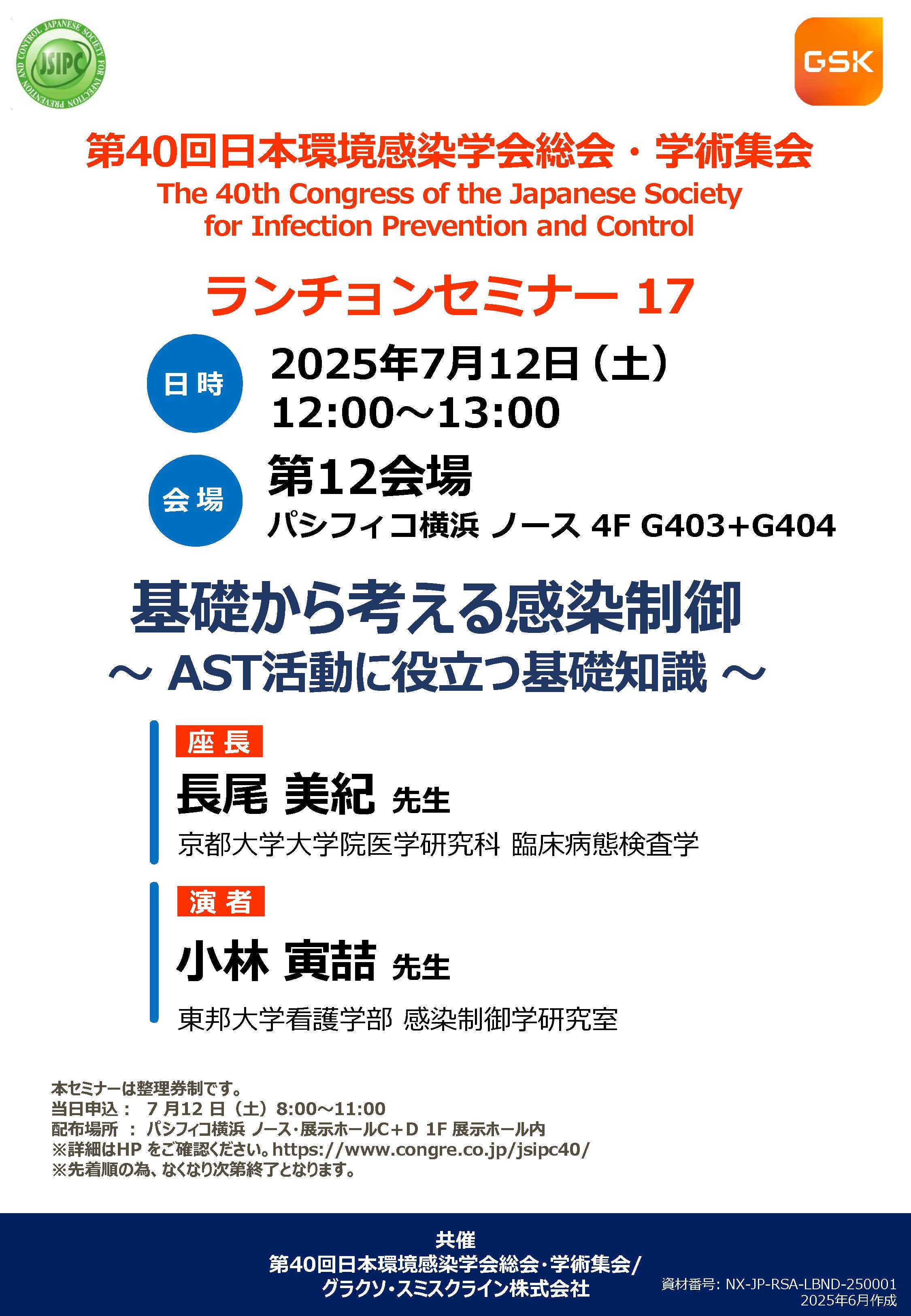 ランチョンセミナー17 基本から考える感染制御~AST活動に役立つ基礎知識~ 2025年7月12日(土) 12:00 - 13:00 第12会場 | ノース 4F G403+G404 共催:グラクソ・スミスクライン株式会社 |