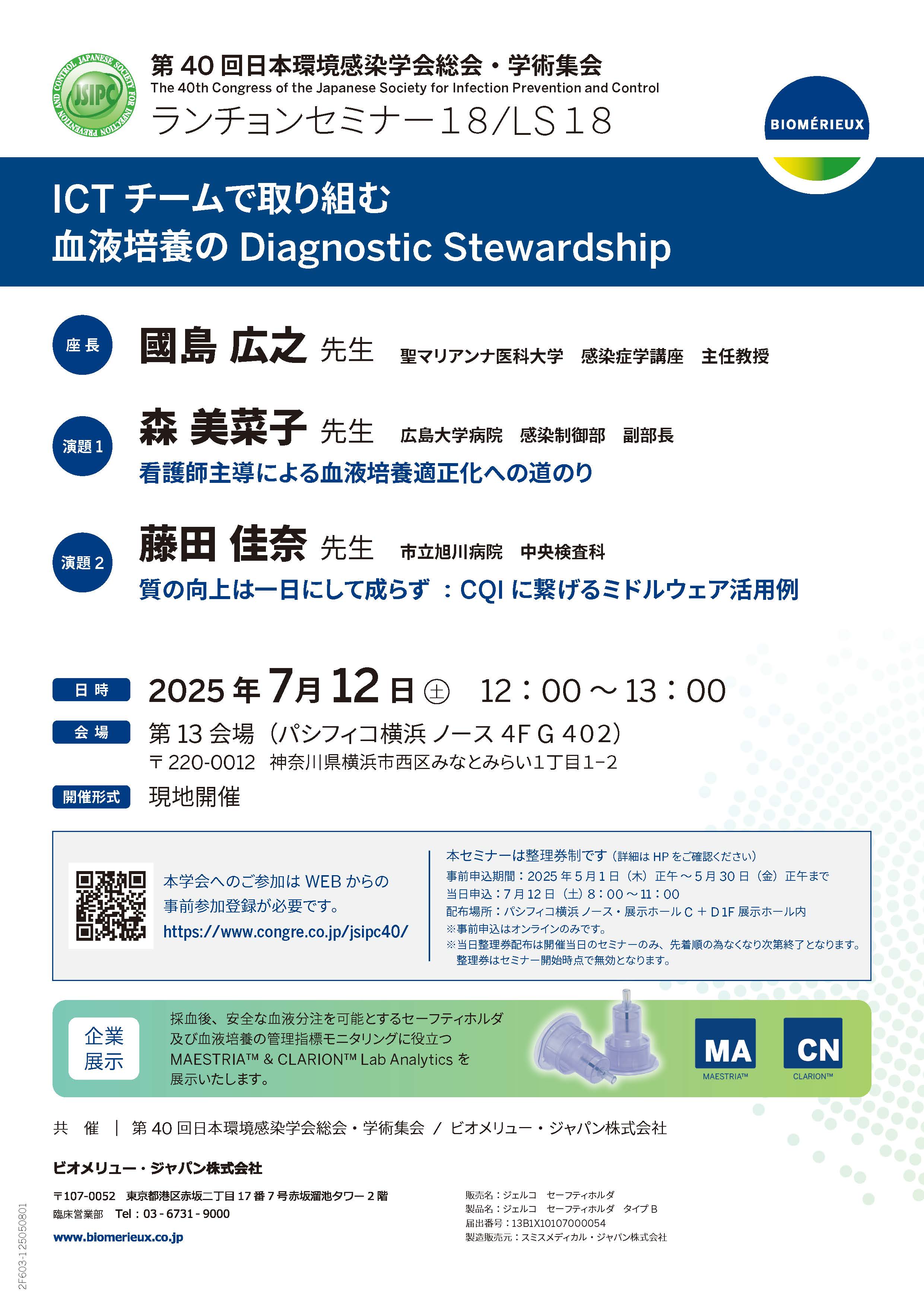 ランチョンセミナー18 ICTチームで取り組む血液培養のDiagnostic Stewardship 2025年7月12日(土) 12:00 - 13:00 第13会場 | ノース 4F G402 共催:ビオメリュー・ジャパン株式会社 |