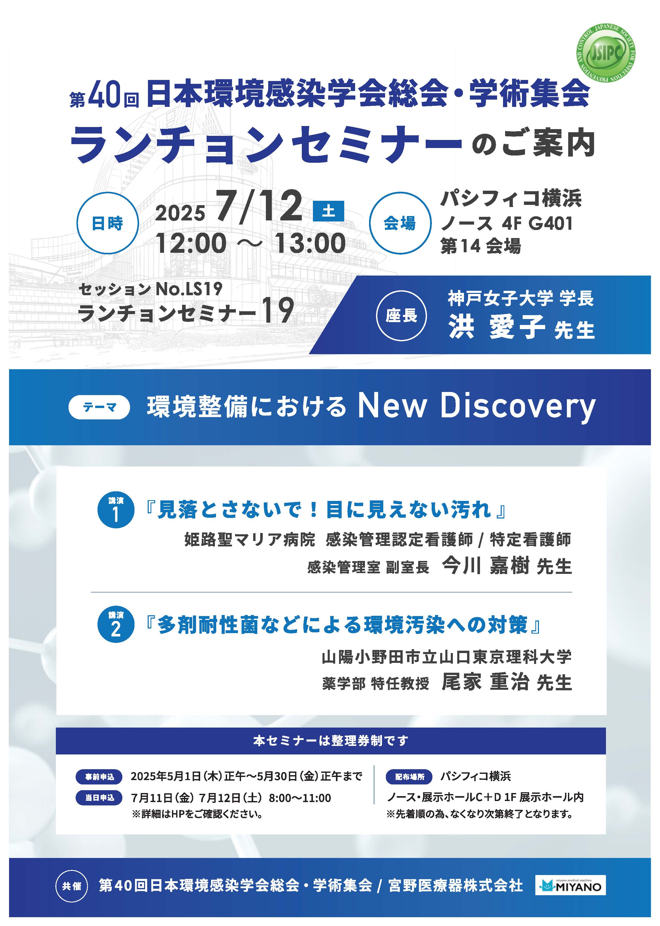 ランチョンセミナー19 環境整備におけるNew Discovery 2025年7月12日(土) 12:00 - 13:00 第14会場 | ノース 4F G401 共催:宮野医療器株式会社 |