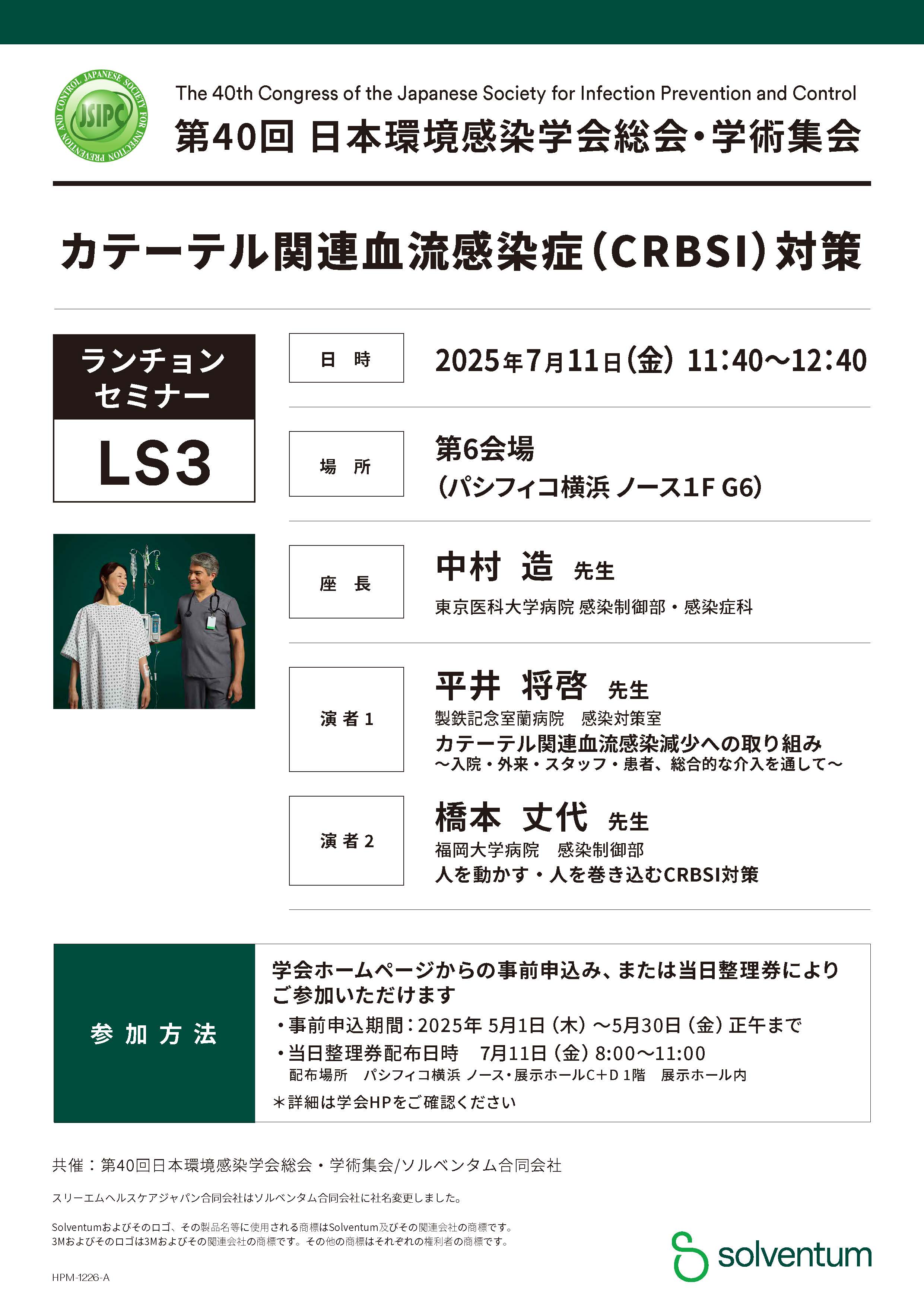 ランチョンセミナー3 カテーテル関連血流感染症(CRBSI)対策 2025年7月11日(金) 11:40 - 12:40 第6会場 | ノース 1F G6 共催:ソルベンタム合同会社 |