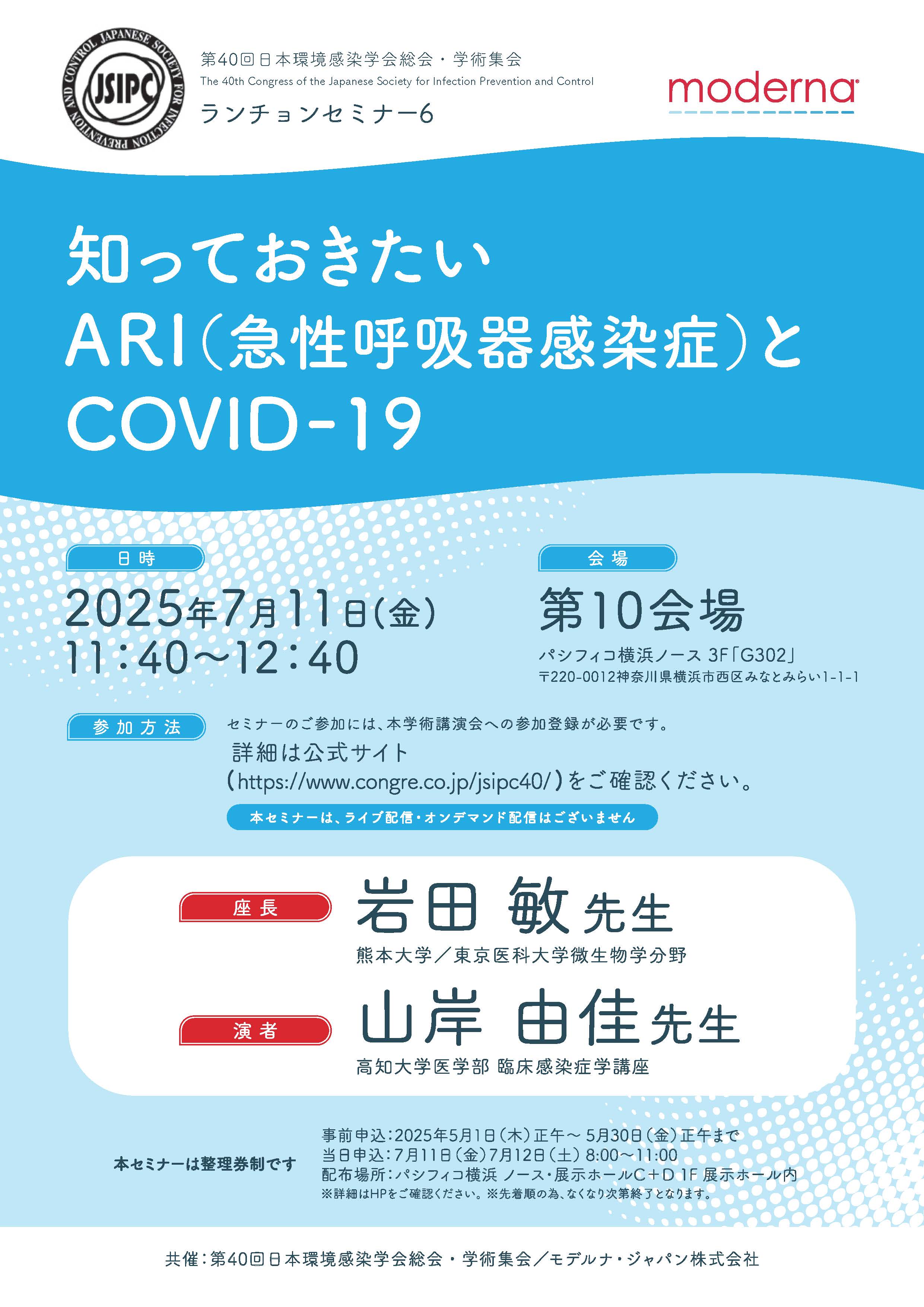 ランチョンセミナー6 知っておきたいARI(急性呼吸器感染症)とCOVID-19 2025年7月11日(金) 11:40 - 12:40 第10会場 | ノース 3F G302 共催:モデルナ・ジャパン株式会社 |