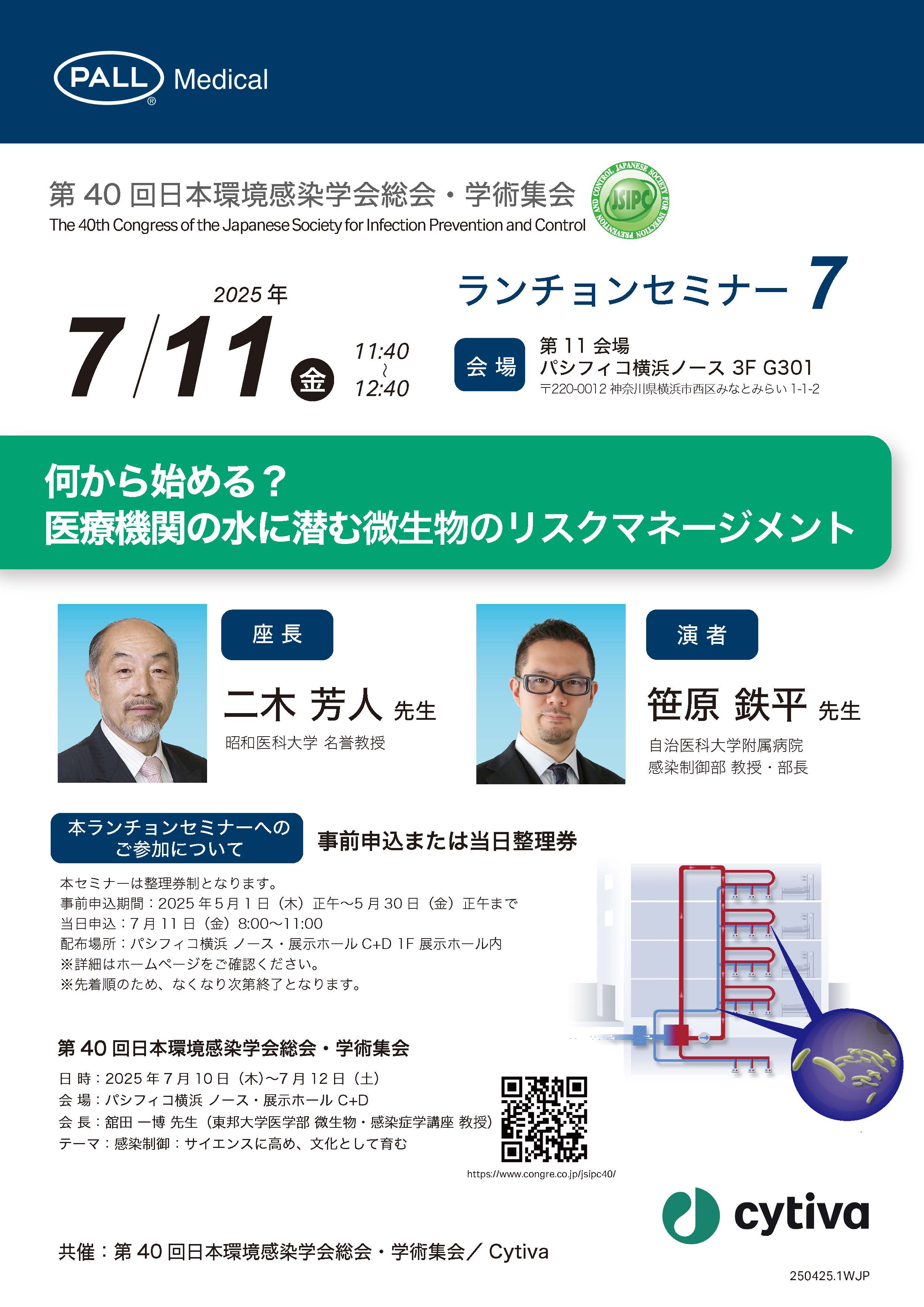 ランチョンセミナー7 何から始める?医療機関の水に潜む微生物のリスクマネージメント 2025年7月11日(金) 11:40 - 12:40 第11会場 | ノース 3F G301 共催:Cytiva |