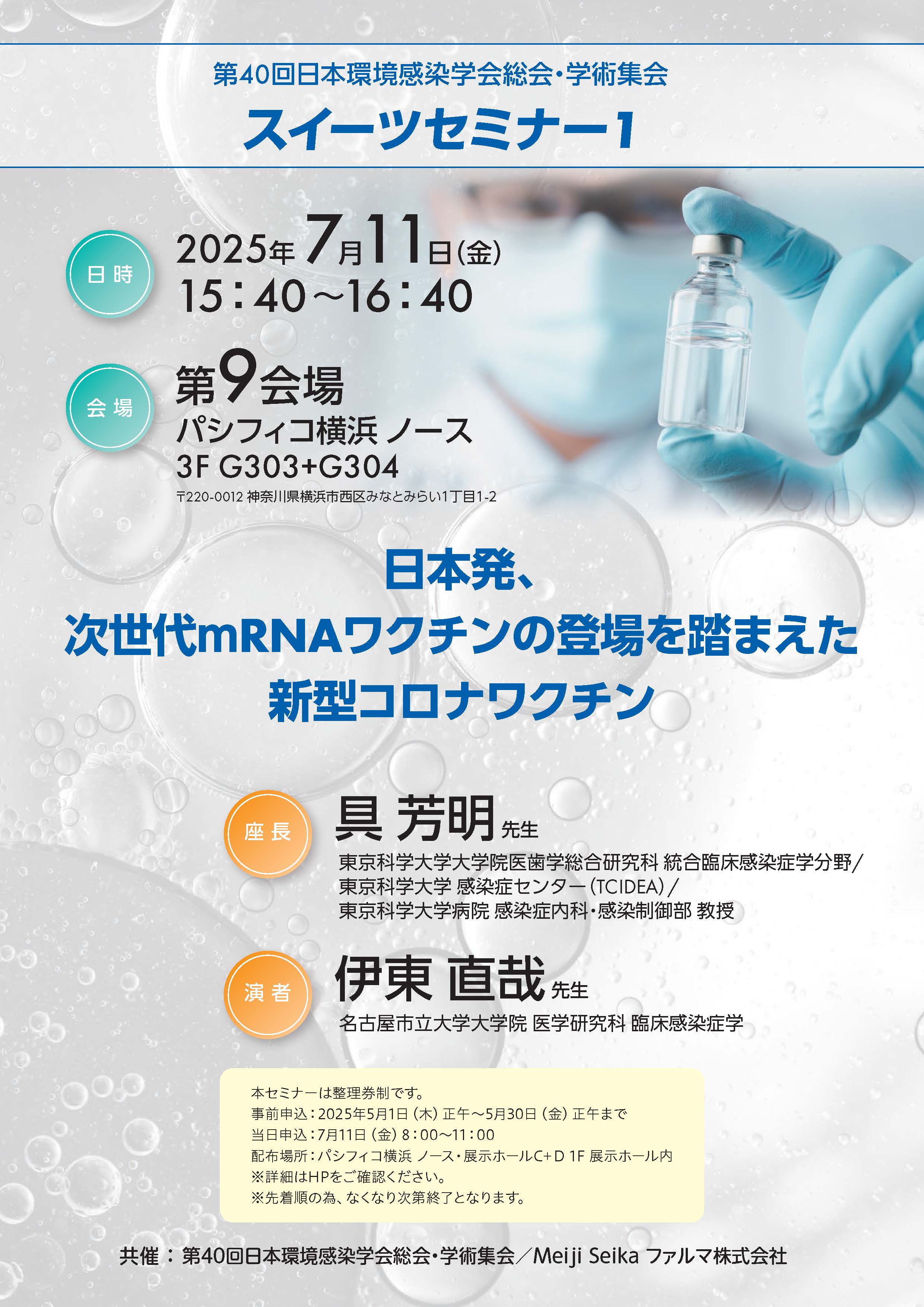 スイーツセミナー1 日本発、次世代mRNAワクチンの登場を踏まえた新型コロナワクチン 2025年7月11日(金) 15:40 - 16:40 第9会場 | ノース 3F G303+G304 共催:Meiji Seika ファルマ株式会社 |