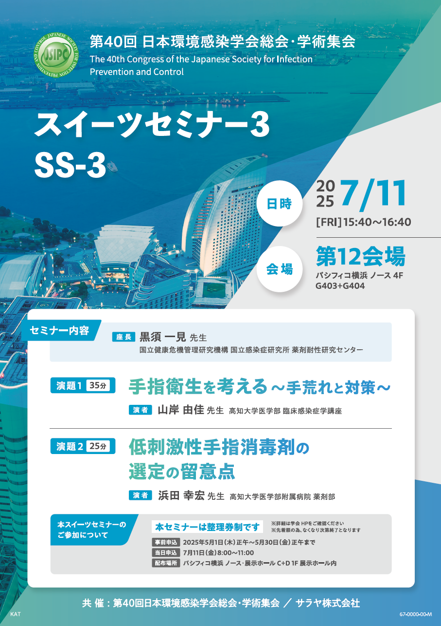 スイーツセミナー3 手指衛生を考える~手荒れと対策~/低刺激性手指消毒剤の選定の留意点 2025年7月11日(金) 15:40 - 16:40 第12会場 | ノース 4F G403+G404 共催:サラヤ株式会社 |