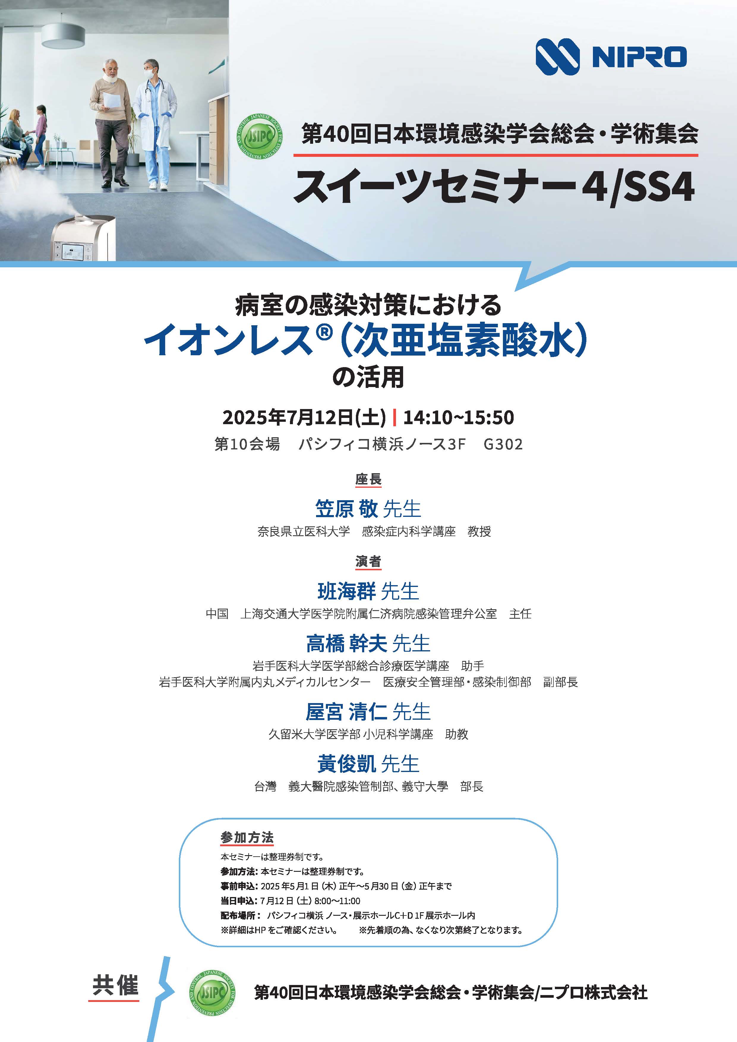 スイーツセミナー4 病室の感染対策におけるイオンレス®(次亜塩素酸水)の活用 2025年7月12日(土) 14:10 - 15:50 第10会場 | ノース 3F G302 共催:ニプロ株式会社 |