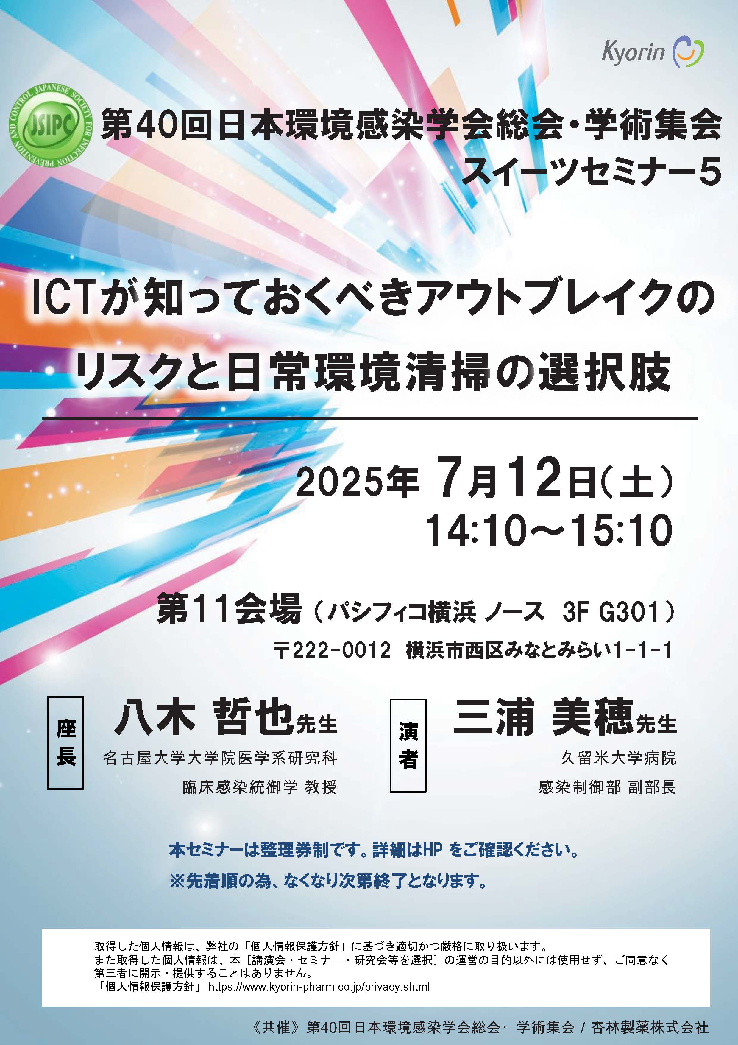 スイーツセミナー5 ICTが知っておくべきアウトブレイクのリスクと日常環境清掃の選択肢 2025年7月12日(土) 14:10 - 15:10 第11会場 | ノース 3F G301 共催:杏林製薬株式会社 |