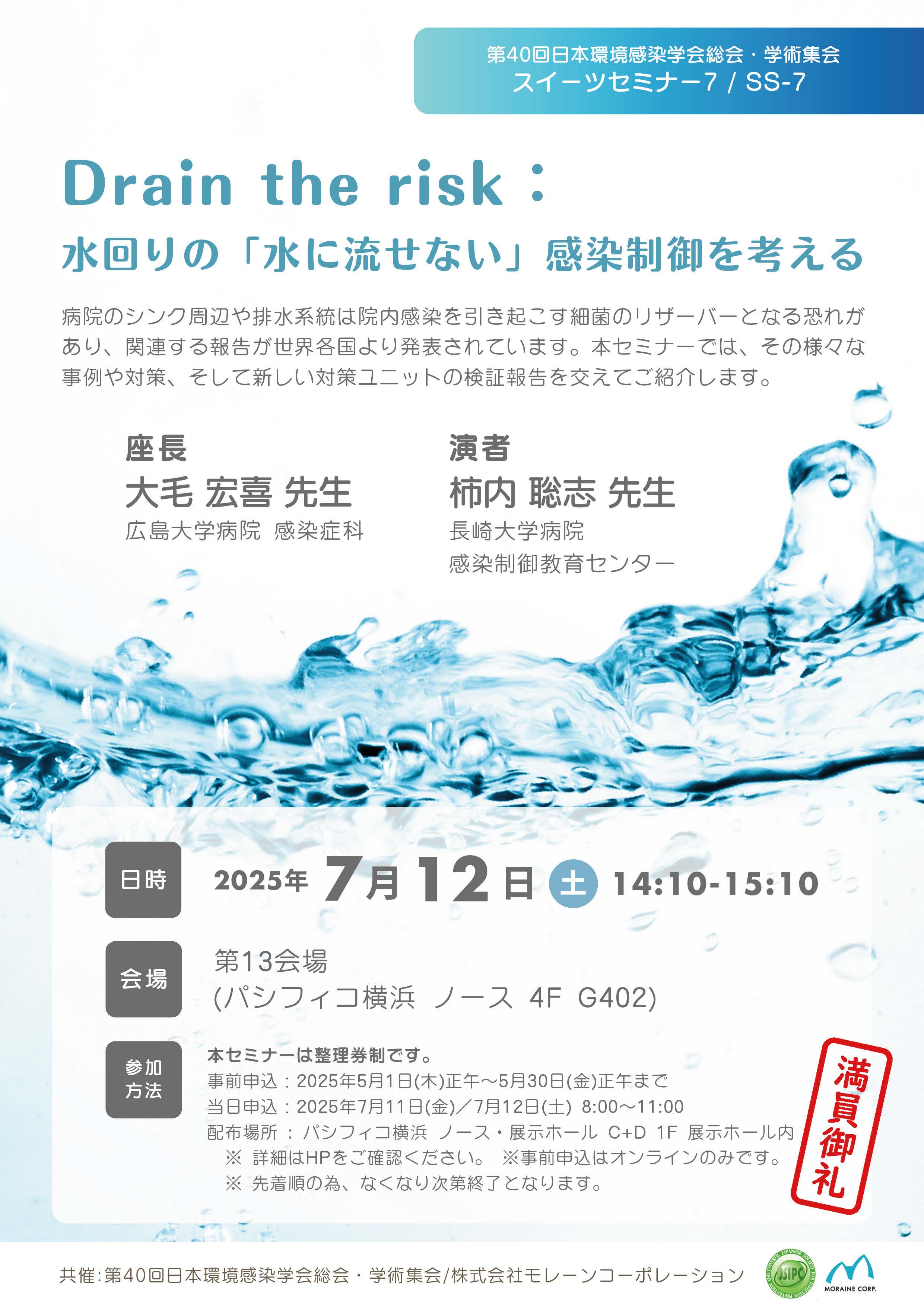 スイーツセミナー7 Drain the risk:水回りの「水に流せない」感染制御を考える 2025年7月12日(土) 14:10 - 15:10 第13会場 | ノース 4F G402 共催:株式会社モレーンコーポレーション |