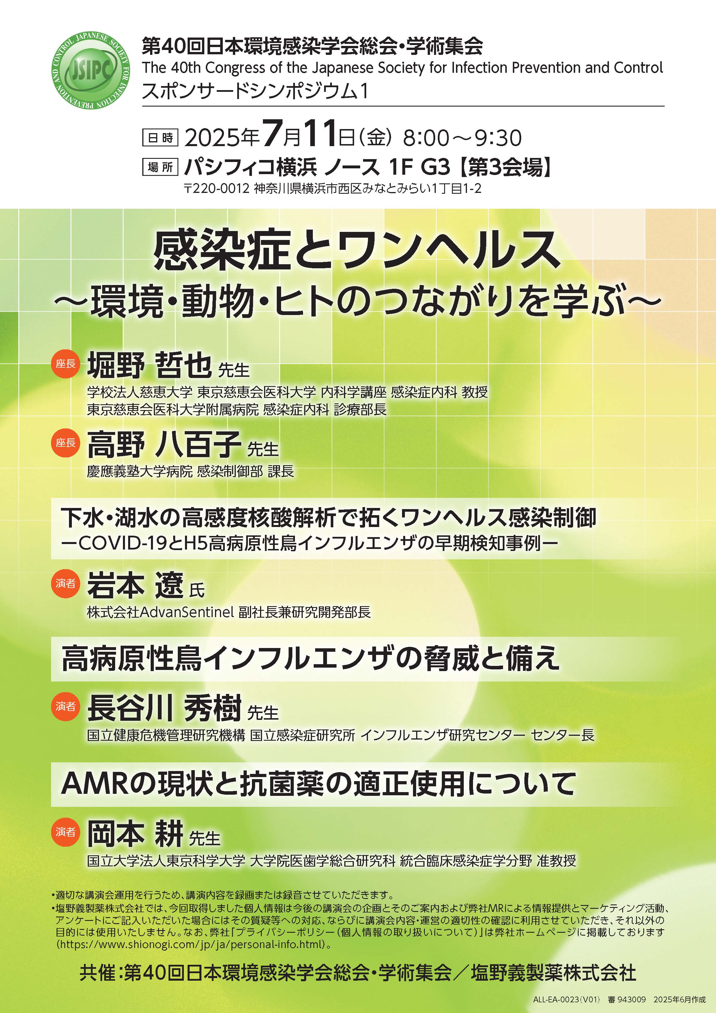 スポンサードシンポジウム1 感染症とワンヘルス~環境・動物・ヒトのつながりを学ぶ~ 2025年7月11日(金) 8:00 - 9:30 第3会場 | ノース 1F G3 共催:塩野義製薬株式会社 |