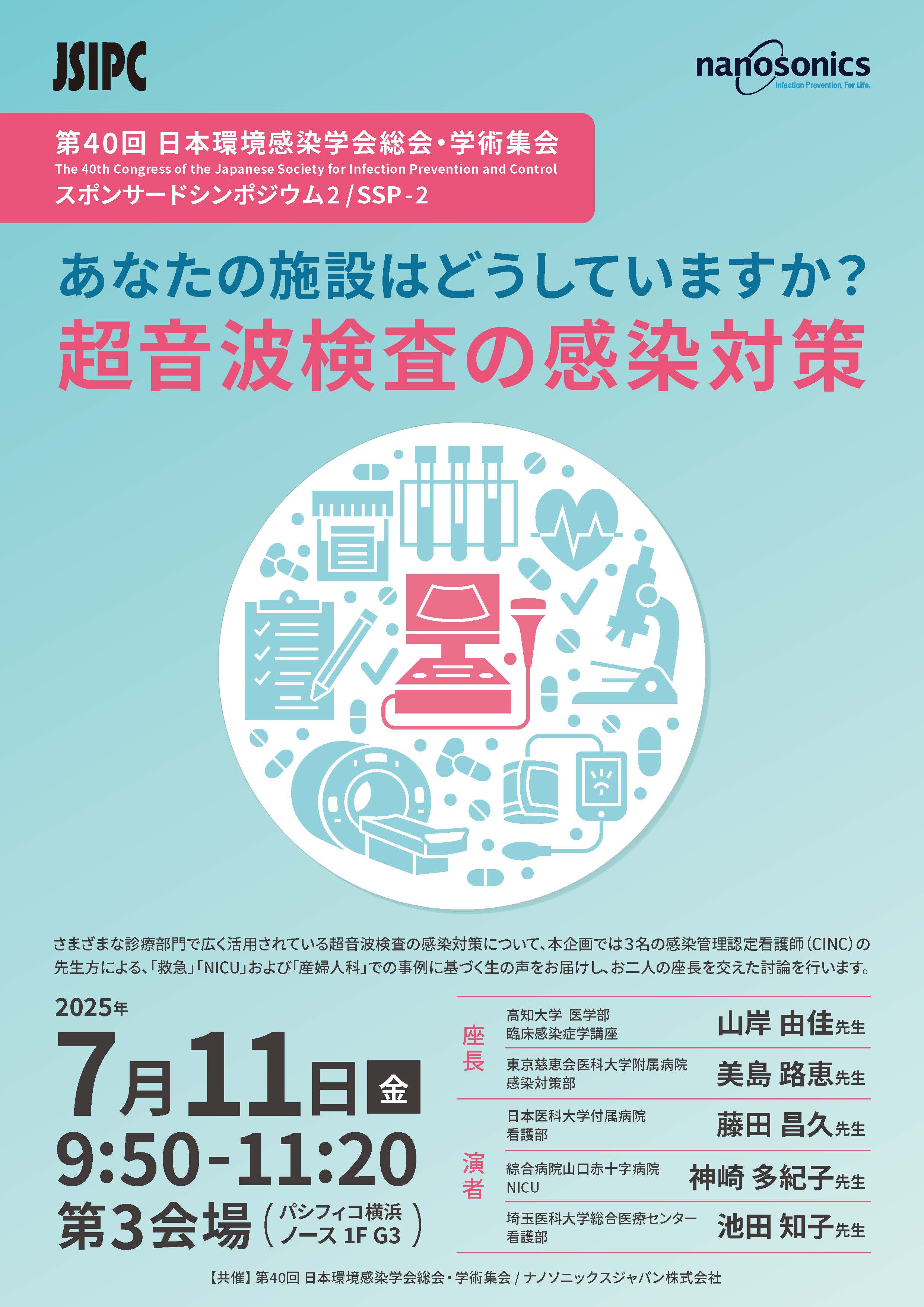 スポンサードシンポジウム2 あなたの施設ではどうしていますか?超音波検査の感染対策 2025年7月11日(金) 9:50 - 11:20 第3会場 | ノース 1F G3 共催:ナノソニックスジャパン株式会社 |