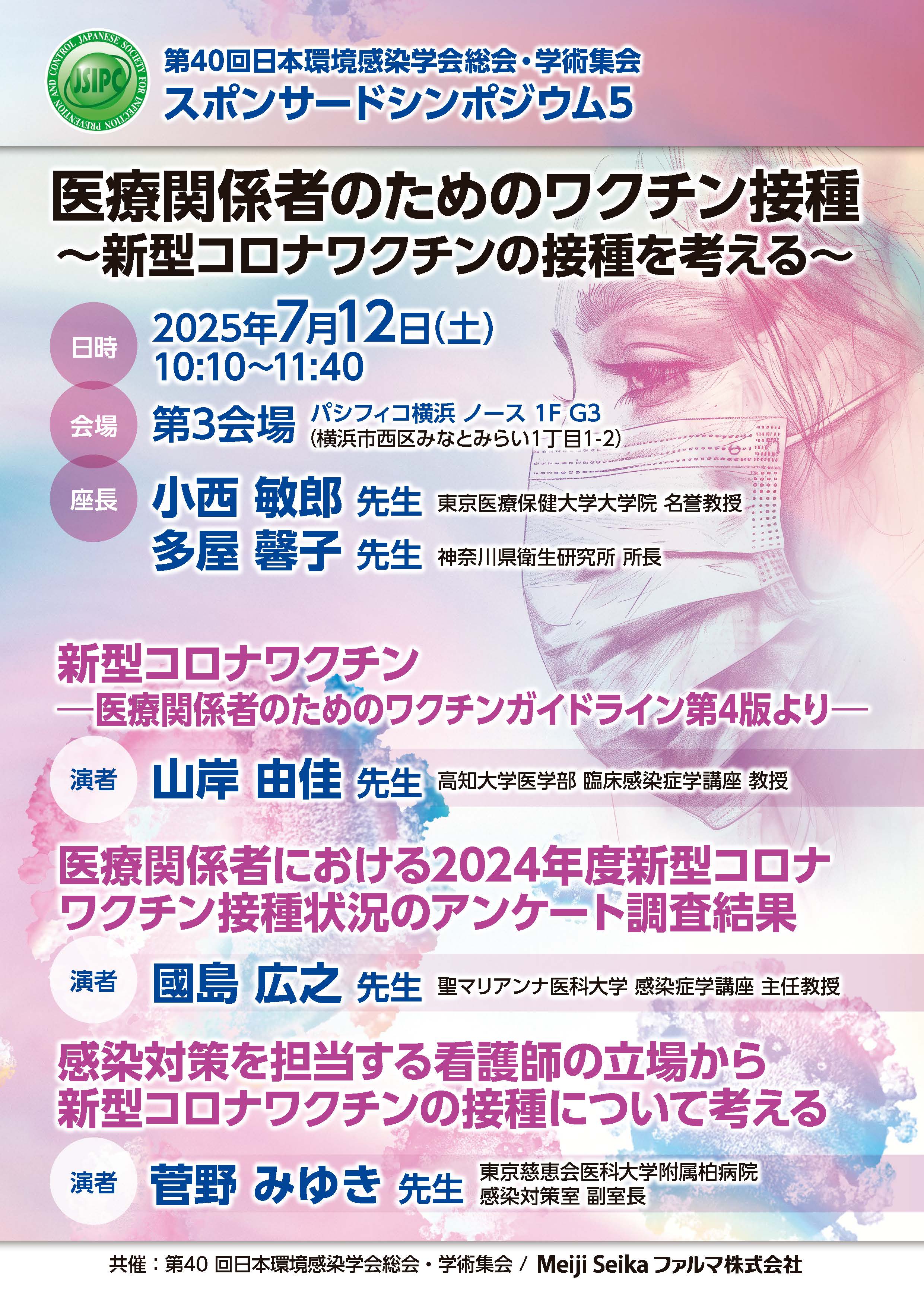スポンサードシンポジウム5 医療関係者のためのワクチン接種~新型コロナワクチンの接種を考える~ 2025年7月12日(土) 10:10 - 11:40 第3会場 | ノース 1F G3 共催:Meiji Seika ファルマ株式会社 |