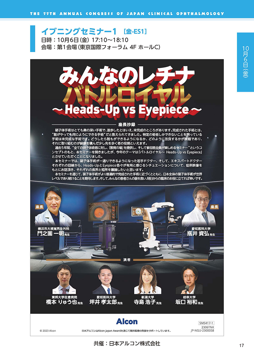 イブニングセミナー1 みんなのレチナ バトルロイヤル ~ Heads-Up vs Eyepiece 2023年10月6日(金) 17:10 - 18:10 第1会場 | 東京国際フォーラム 4F ホールC 共催:日本アルコン株式会社 |