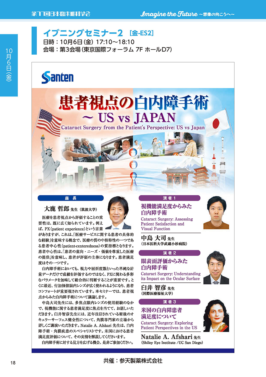 イブニングセミナー2 患者視点の白内障手術~ US vs JAPAN 2023年10月6日(金) 17:10 - 18:10 第3会場 | 東京国際フォーラム 7F ホールD7 共催:参天製薬株式会社 |