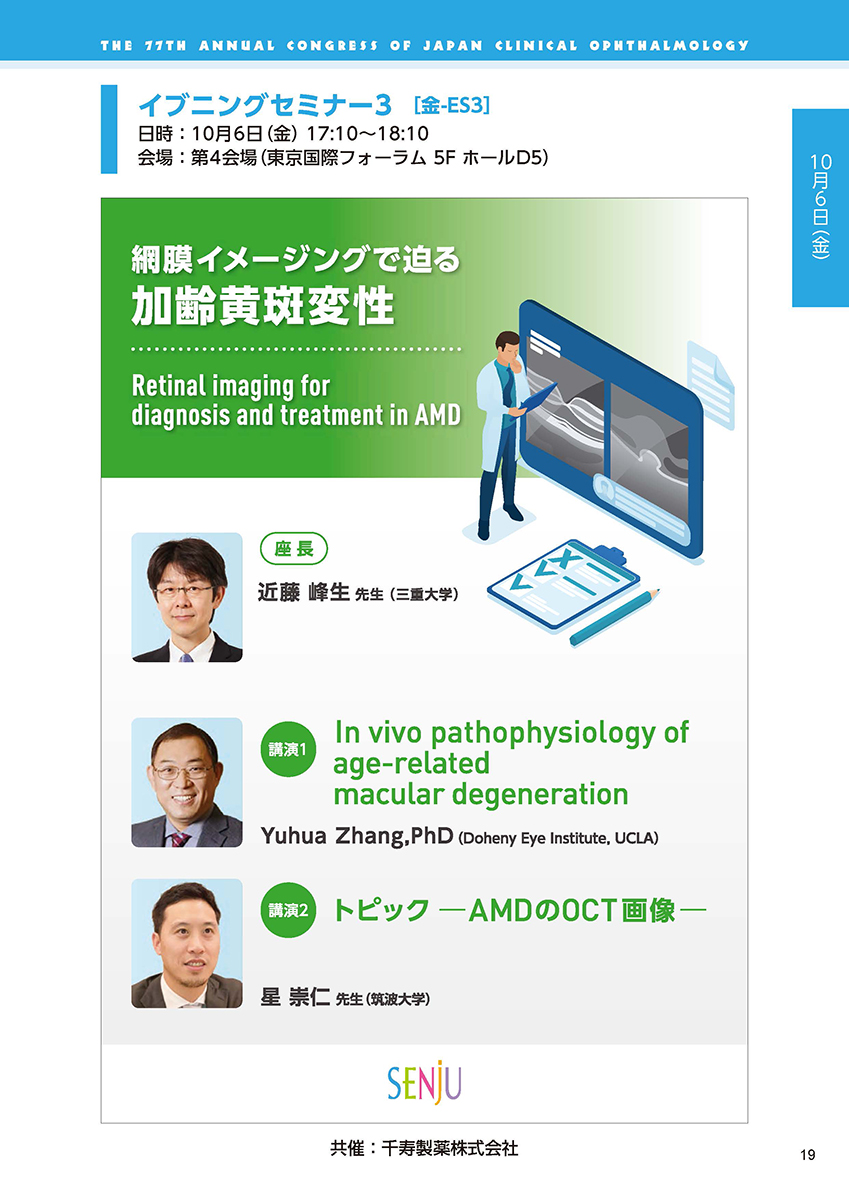 イブニングセミナー3 網膜イメージングで迫る加齢黄斑変性 2023年10月6日(金) 17:10 - 18:10 第4会場 | 東京国際フォーラム 5F ホールD5 共催:千寿製薬株式会社 |