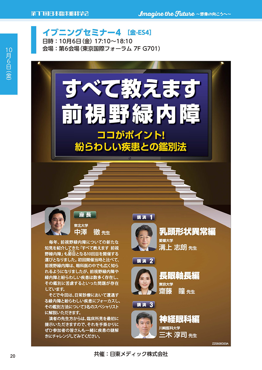 イブニングセミナー4 すべて教えます前視野緑内障ココがポイント! 紛らわしい疾患との鑑別法 2023年10月6日(金) 17:10 - 18:10 第6会場 | 東京国際フォーラム 7F G701 共催:日東メディック株式会社 |