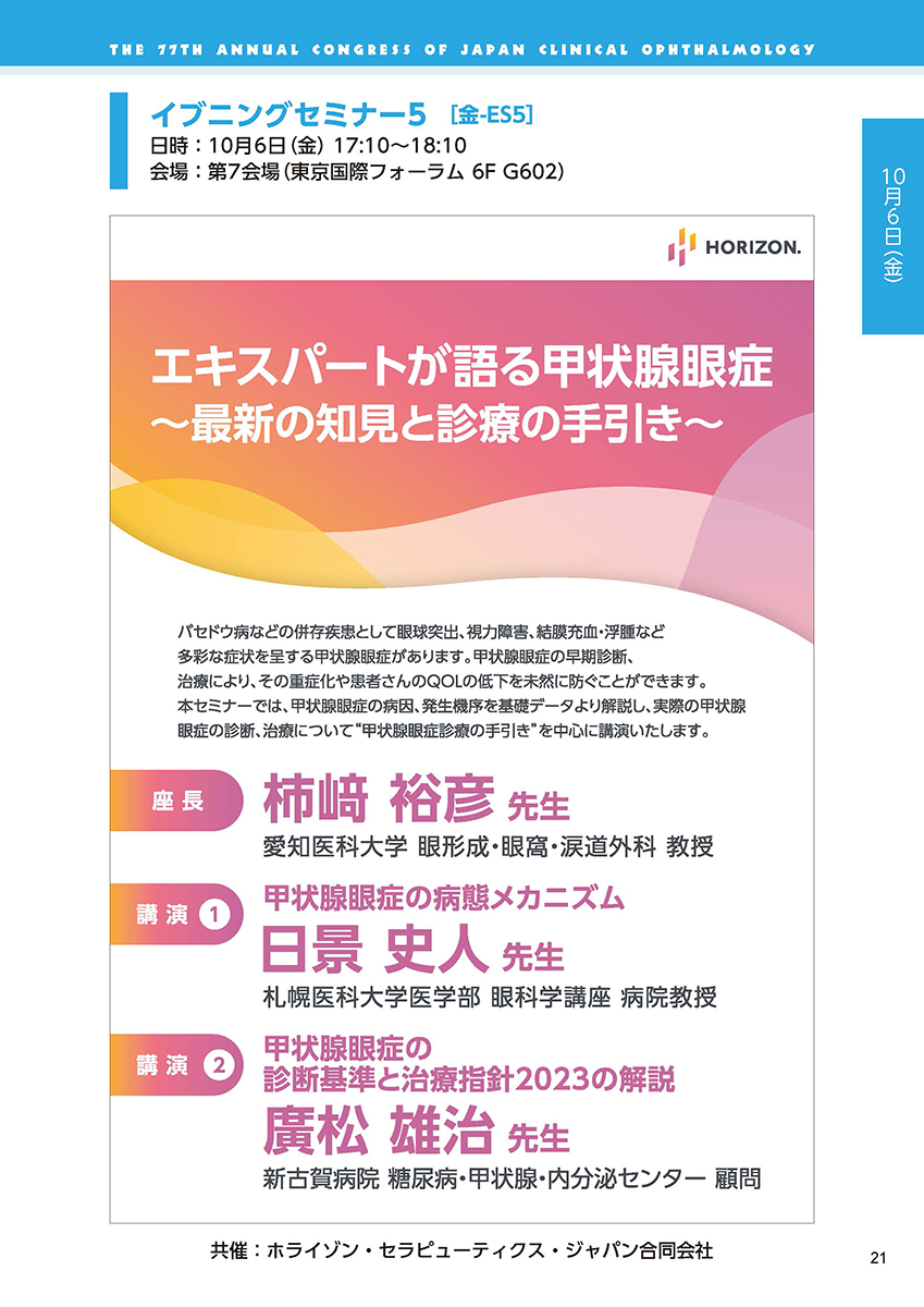 イブニングセミナー5 エキスパートが語る甲状腺眼症 ~最新の知見と診療の手引き~ 2023年10月6日(金) 17:10 - 18:10 第7会場 | 東京国際フォーラム 6F G602 共催:ホライゾン・セラピューティクス・ジャパン合同会社 |