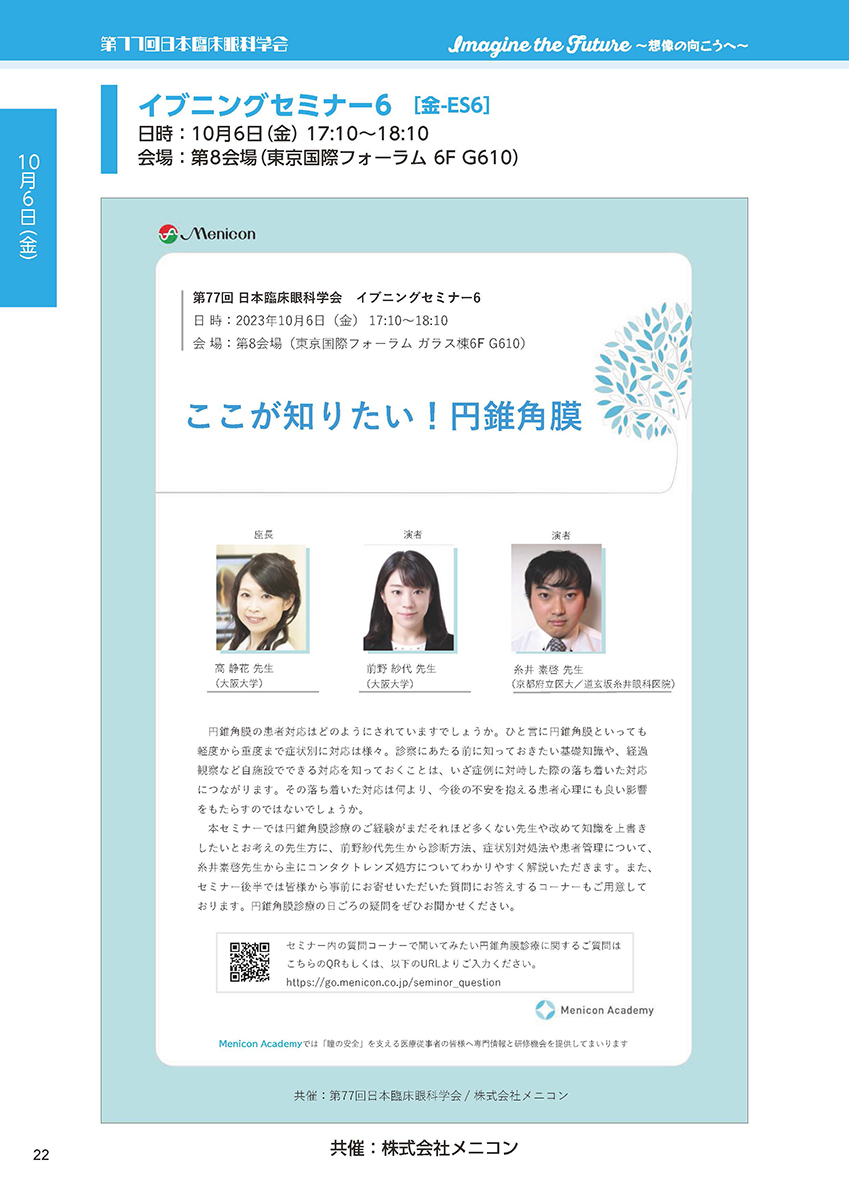 イブニングセミナー6 ここが知りたい!円錐角膜 2023年10月6日(金) 17:10 - 18:10 第8会場 | 東京国際フォーラム 6F G610 共催:株式会社メニコン |