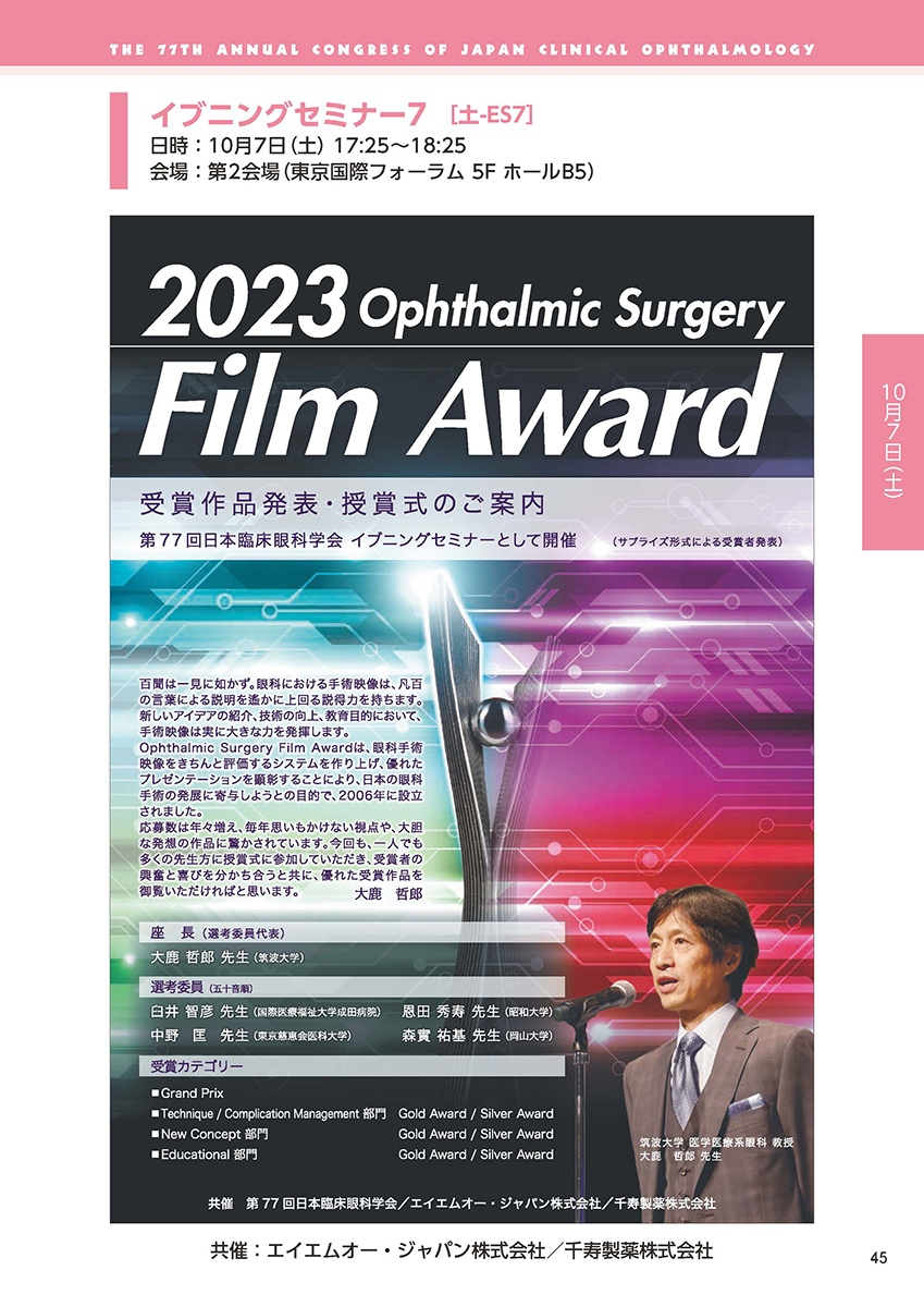 イブニングセミナー7 2023 Ophthalmic Surgery Film Award 2023年10月7日(土) 17:25 - 18:25 第2会場 | 東京国際フォーラム 5F ホールB5 共催:エイエムオー・ジャパン株式会社/千寿製薬株式会社 |