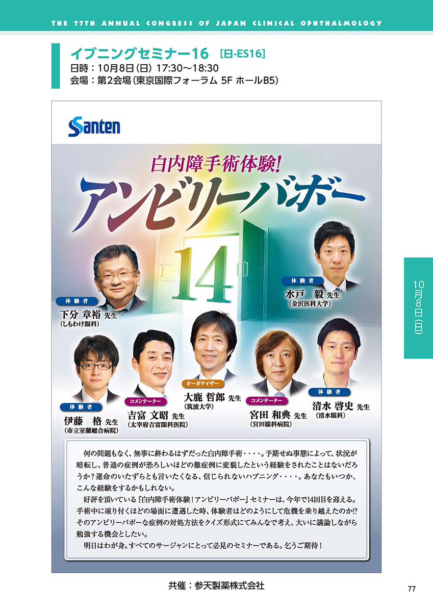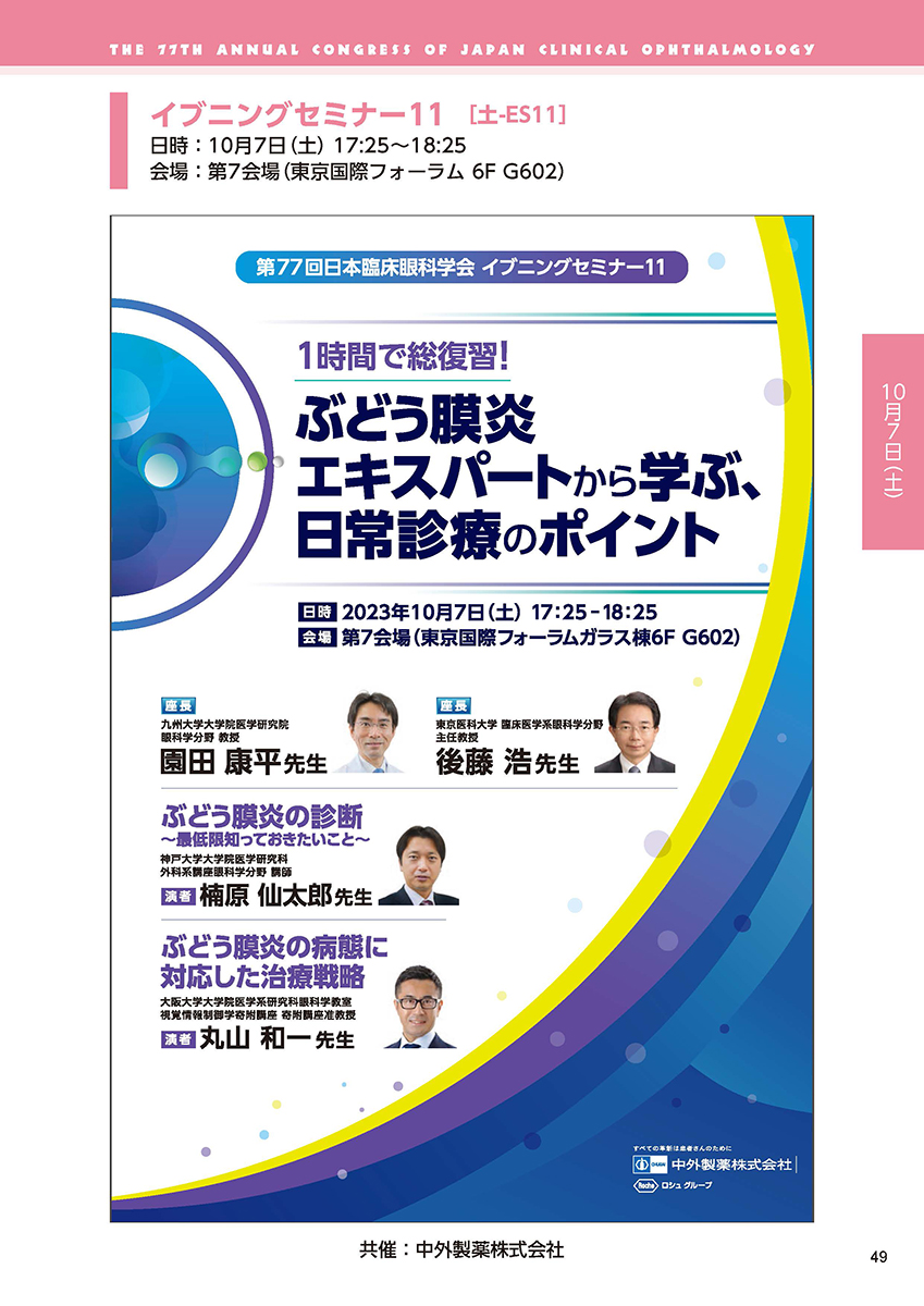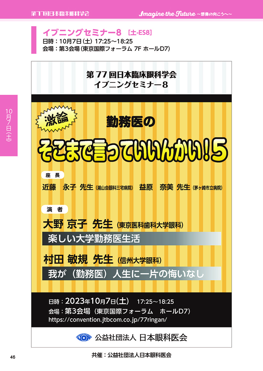 イブニングセミナー8 激論 勤務医のそこまで言っていいんかい!5 2023年10月7日(土) 17:25 - 18:25 第3会場 | 東京国際フォーラム 7F ホールD7 共催:公益社団法人日本眼科医会 |