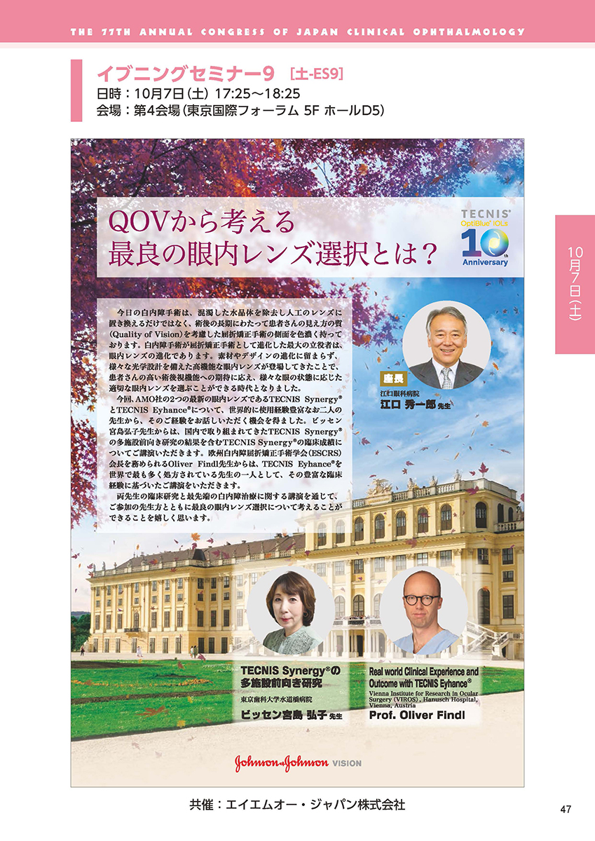 イブニングセミナー9 QOVから考える最良の眼内レンズ選択とは? 2023年10月7日(土) 17:25 - 18:25 第4会場 | 東京国際フォーラム 5F ホールD5 共催:エイエムオー・ジャパン株式会社 |