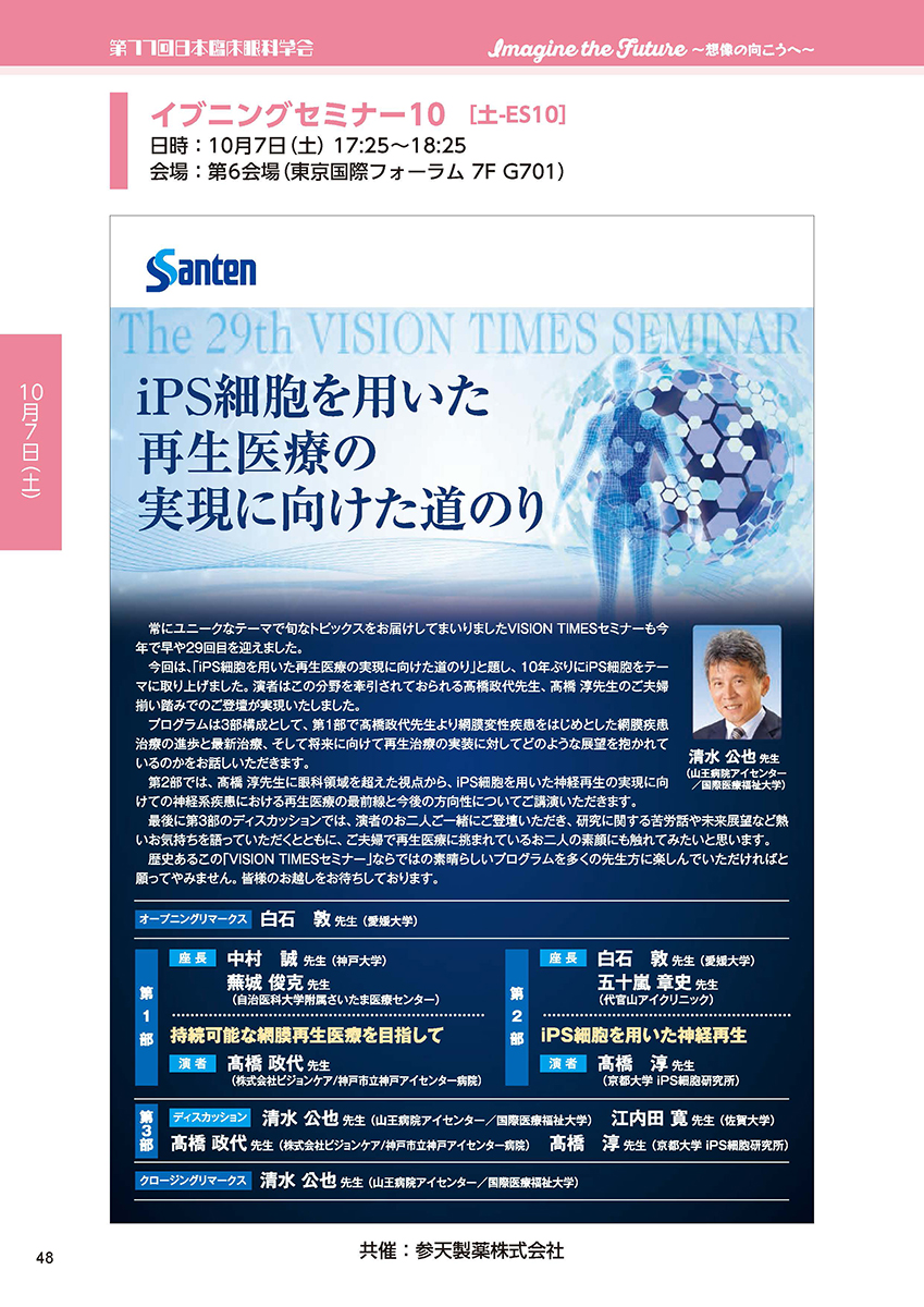 イブニングセミナー10 The 29th VISION TIMES SEMINAR iPS細胞を用いた再生医療の実現に向けた道のり 2023年10月7日(土) 17:25 - 18:25 第6会場 | 東京国際フォーラム 7F G701 共催:参天製薬株式会社 |