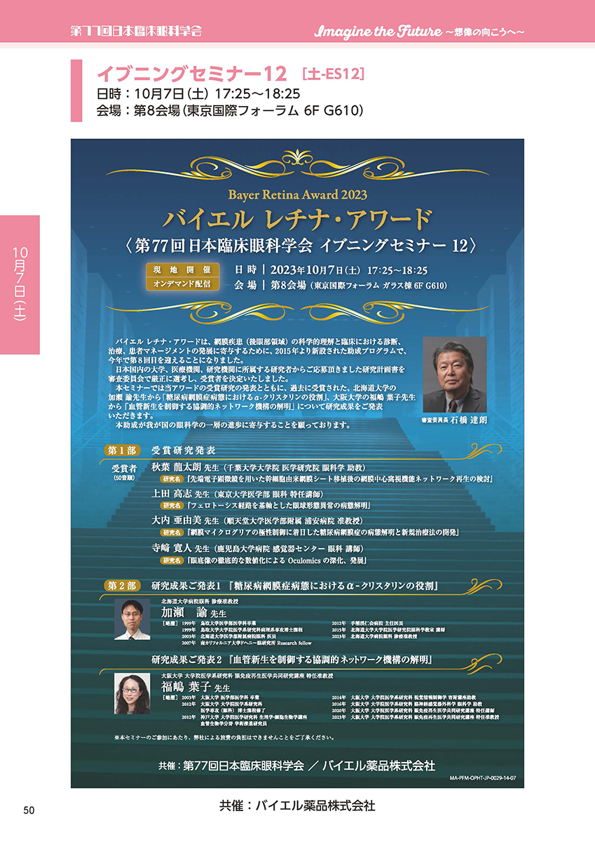 イブニングセミナー12 バイエル レチナ・アワード 2023年10月7日(土) 17:25 - 18:25 第8会場 | 東京国際フォーラム 6F G610 共催:バイエル薬品株式会社 |