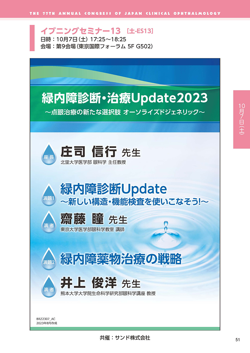 イブニングセミナー13 緑内障診断・治療Update2023 ~点眼治療の新たな選択肢 オーソライズドジェネリック~ 2023年10月7日(土) 17:25 - 18:25 第9会場 | 東京国際フォーラム 5F G502 共催:サンド株式会社 |
