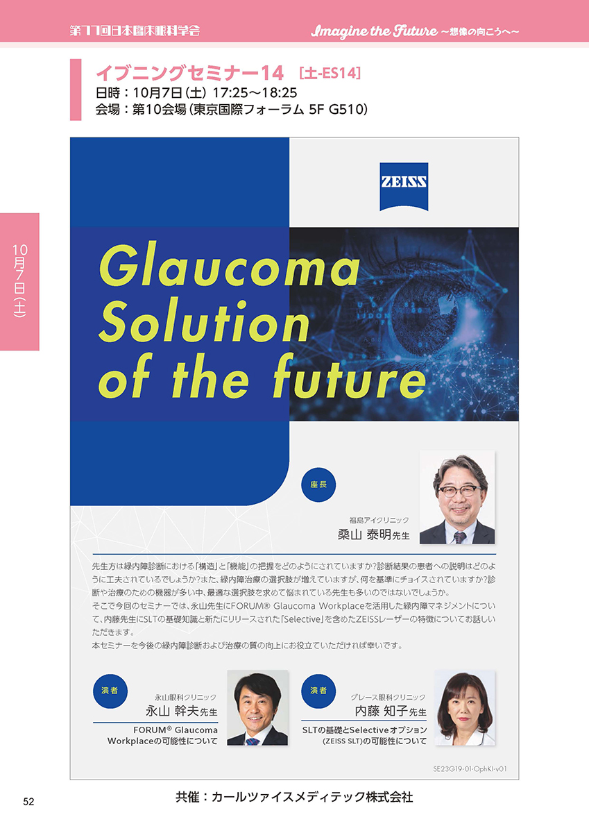 イブニングセミナー14 Glaucoma Solution of the future 2023年10月7日(土) 17:25 - 18:25 第10会場 | 東京国際フォーラム 5F G510 共催:カールツァイスメディテック株式会社 |