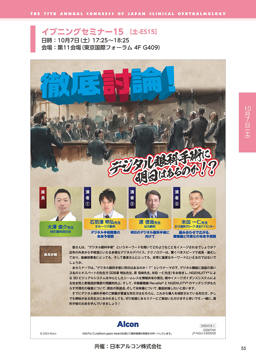 イブニングセミナー15 徹底討論!デジタル眼科手術に明日はあるのか 2023年10月7日(土) 17:25 - 18:25 第11会場 | 東京国際フォーラム 4F G409 共催:日本アルコン株式会社 |