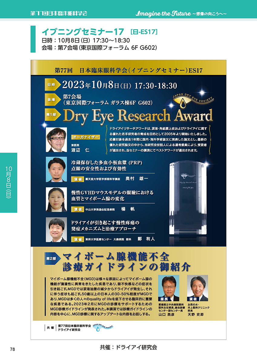 イブニングセミナー17 第1部: Dry Eye Research Award第2部:マイボーム腺機能不全診療ガイドラインの御紹介 2023年10月8日(日) 17:30 - 18:30 第7会場 | 東京国際フォーラム 6F G602 共催:ドライアイ研究会 |