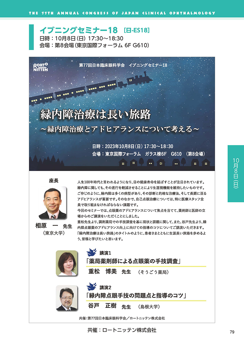 イブニングセミナー18 緑内障治療は長い旅路 ~緑内障治療とアドヒアランスについて考える~ 2023年10月8日(日) 17:30 - 18:30 第8会場 | 東京国際フォーラム 6F G610 共催:ロートニッテン株式会社 |