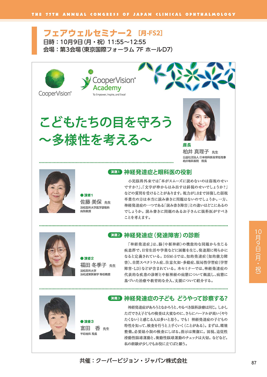 フェアウェルセミナー2 こどもたちの目を守ろう ~多様性を考える~ 2023年10月9日(月) 11:55 - 12:55 第3会場 | 東京国際フォーラム 7F ホールD7 共催:クーパービジョン・ジャパン株式会社 |