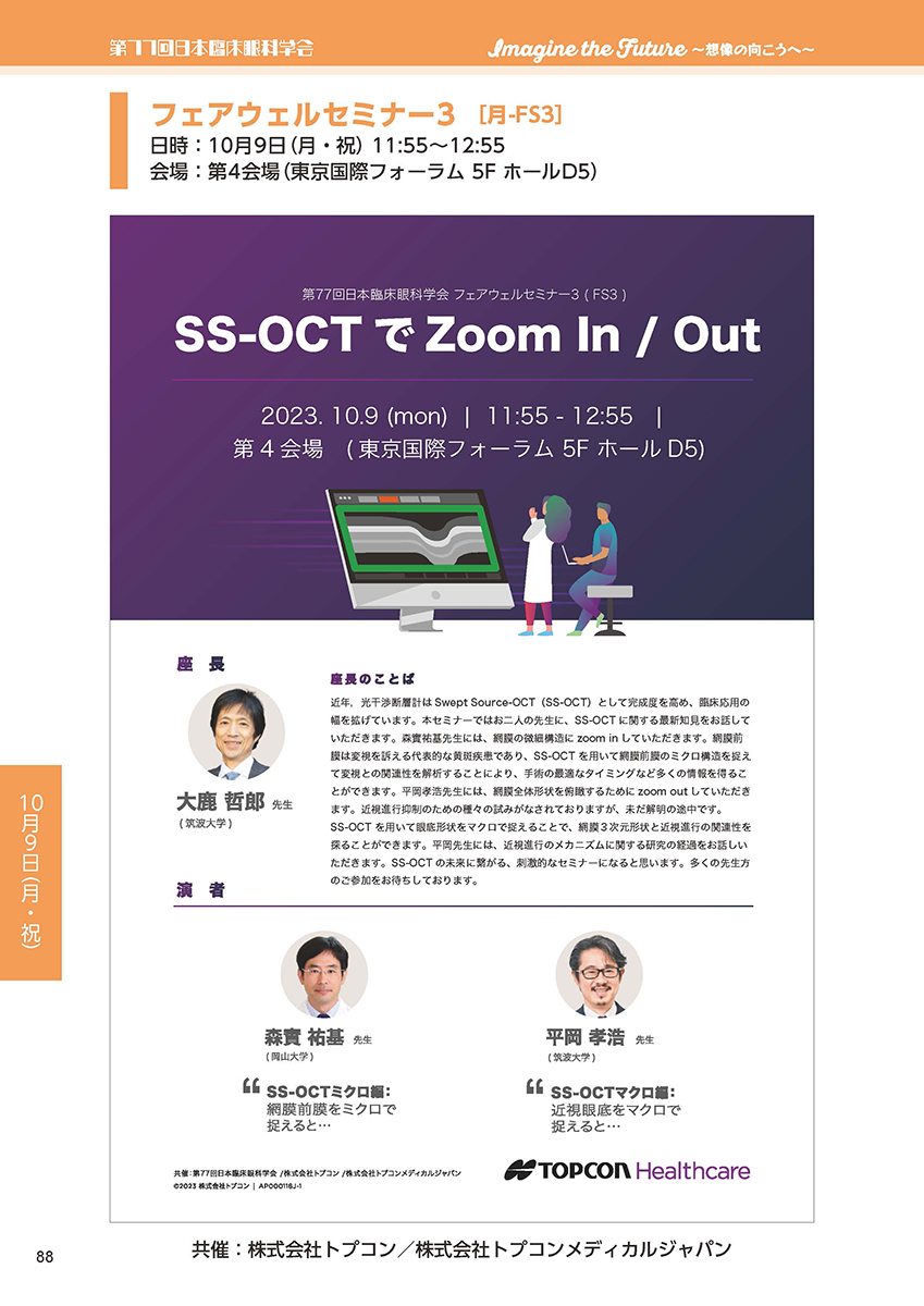 フェアウェルセミナー3 SS-OCTでZoom In / Out 2023年10月9日(月) 11:55 - 12:55 第4会場 | 東京国際フォーラム 5F ホールD5 共催:株式会社トプコン/株式会社トプコンメディカルジャパン |