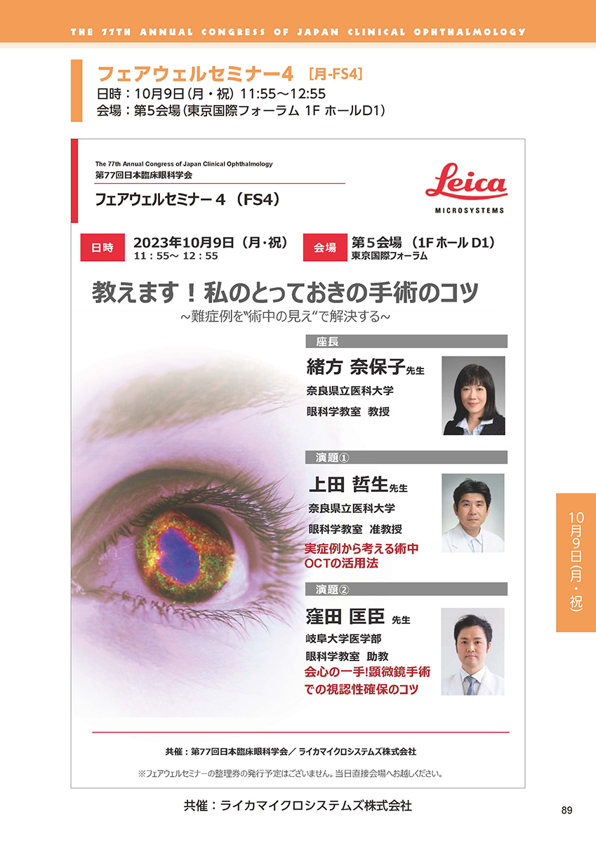 フェアウェルセミナー4 教えます!私のとっておきの手術のコツ~難症例を‶術中の見え“で解決する~ 2023年10月9日(月) 11:55 - 12:55 第5会場 | 東京国際フォーラム 1F ホールD1 共催:ライカマイクロシステムズ株式会社 |