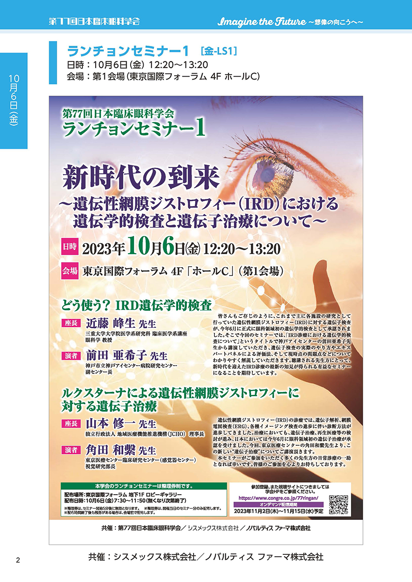 ランチョンセミナー1 新時代の到来 ~遺伝性網膜ジストロフィー(IRD)における遺伝学的検査と遺伝子治療について~ 2023年10月6日(金) 12:20 - 13:20 第1会場 | 東京国際フォーラム 4F ホールC 共催:シスメックス株式会社/ノバルティス ファーマ株式会社 |