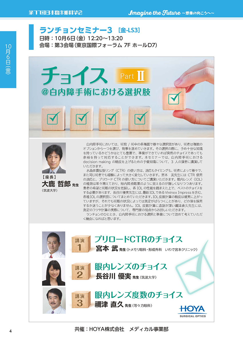 ランチョンセミナー3 チョイス@白内障手術における選択肢 PartⅡ 2023年10月6日(金) 12:20 - 13:20 第3会場 | 東京国際フォーラム 7F ホールD7 共催:HOYA株式会社 メディカル事業部 |