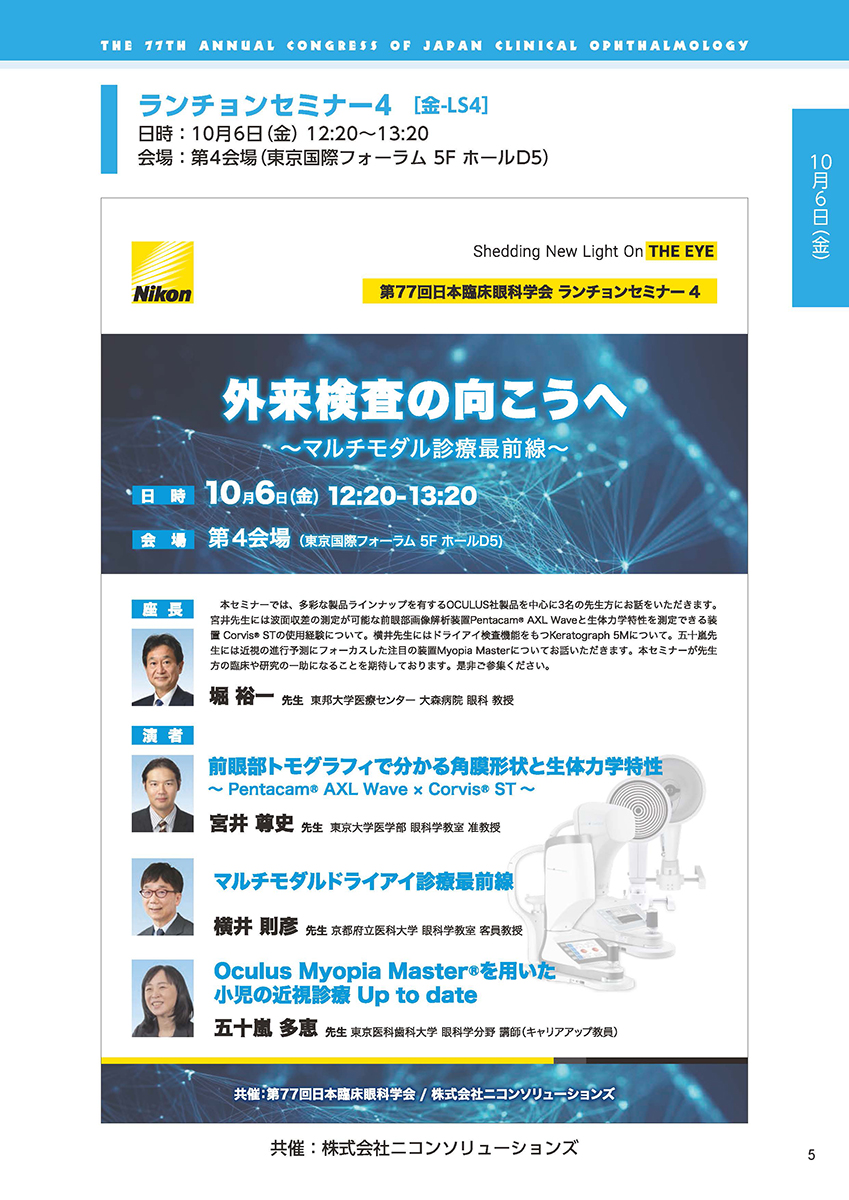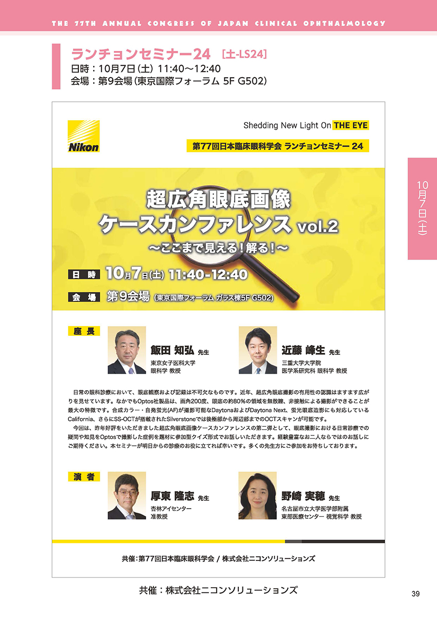 ランチョンセミナー24 超広角眼底画像 ケースカンファレンス Vol.2 ~ここまで見える!解る!~ 2023年10月7日(土) 11:40 - 12:40 第9会場 | 東京国際フォーラム 5F G502 共催:株式会社ニコンソリューションズ |