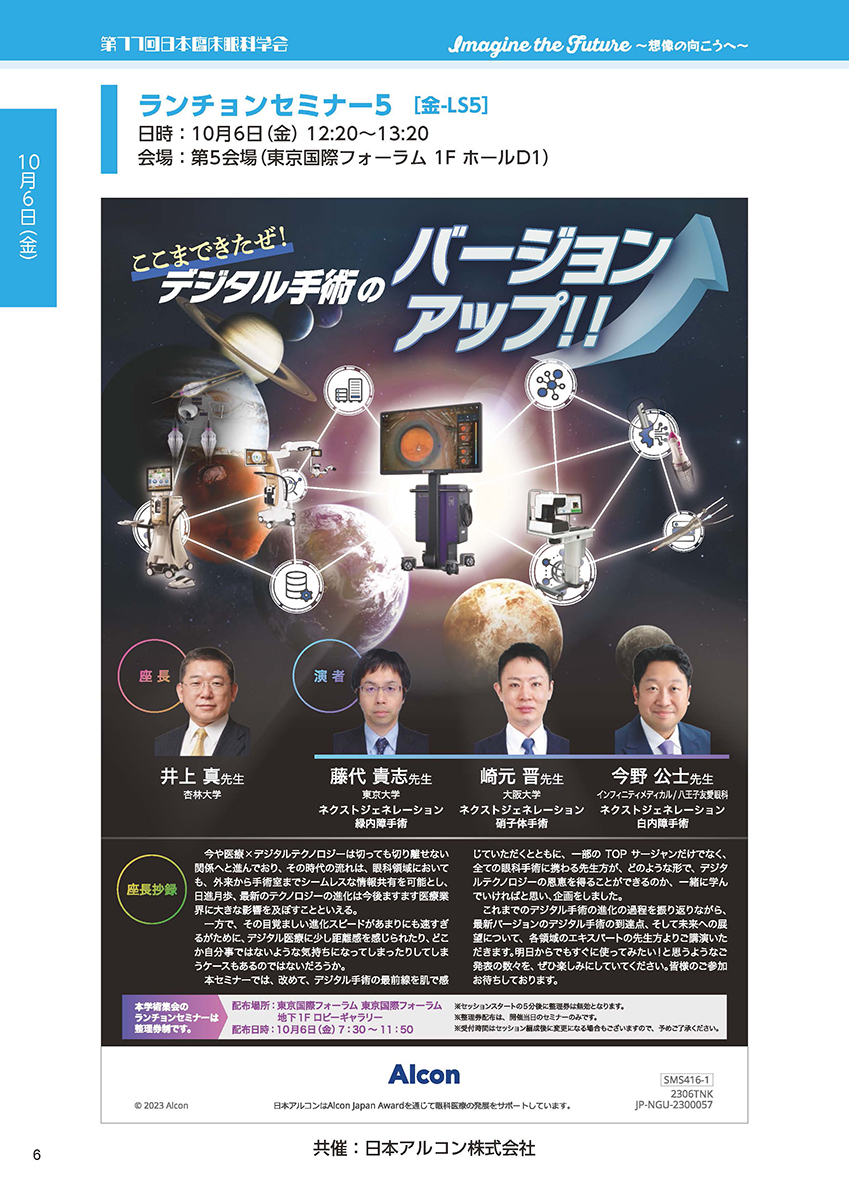 ランチョンセミナー5 ここまできたぜ!デジタル手術のバージョンアップ‼ 2023年10月6日(金) 12:20 - 13:20 第5会場 | 東京国際フォーラム 1F ホールD1 共催:日本アルコン株式会社 |