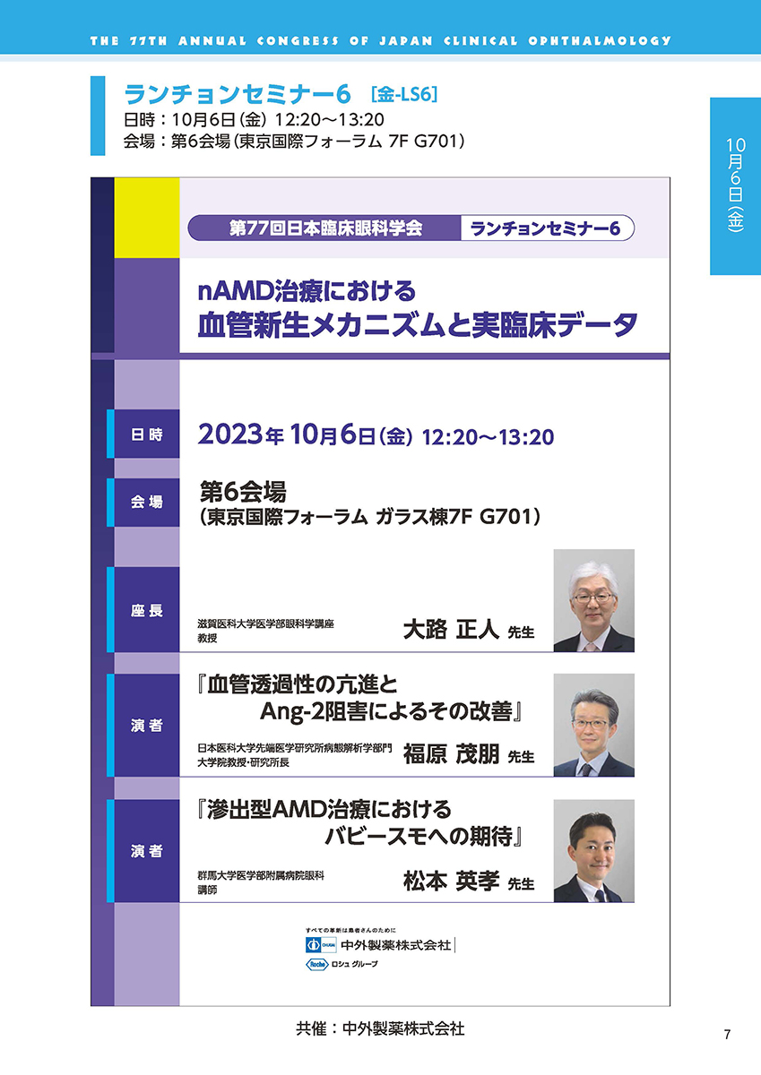 ランチョンセミナー6 nAMD治療における血管新生メカニズムと実臨床データ 2023年10月6日(金) 12:20 - 13:20 第6会場 | 東京国際フォーラム 7F G701 共催:中外製薬株式会社 |