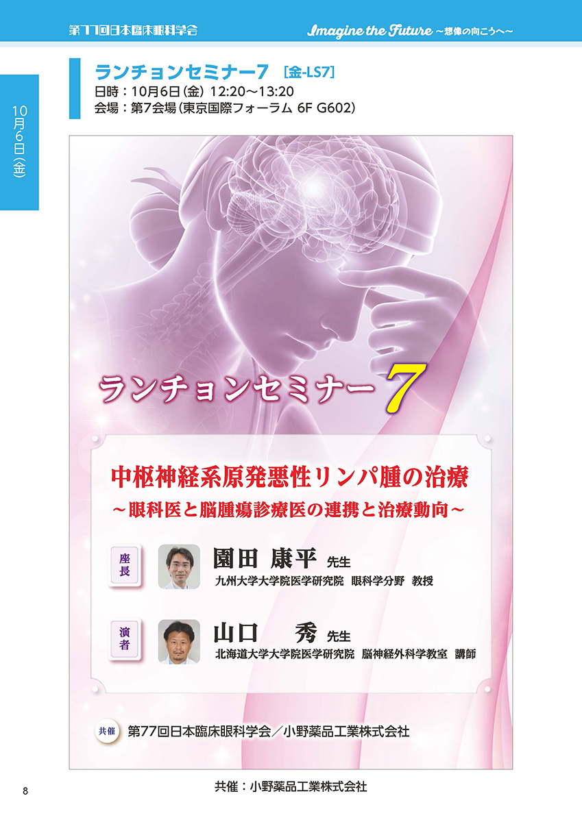 ランチョンセミナー7 中枢神経系原発悪性リンパ腫の治療 ~眼科医と脳腫瘍診療医の連携と治療動向~ 2023年10月6日(金) 12:20 - 13:20 第7会場 | 東京国際フォーラム 6F G602 共催:小野薬品工業株式会社 |