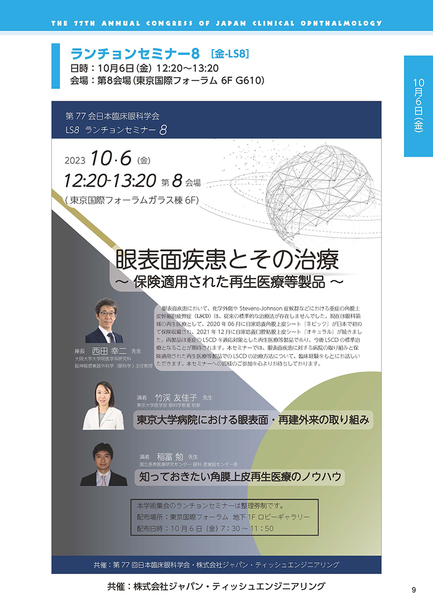 ランチョンセミナー8 眼表面疾患とその治療 ~保険適用された再生医療等製品~ 2023年10月6日(金) 12:20 - 13:20 第8会場 | 東京国際フォーラム 6F G610 共催:株式会社ジャパン・ティッシュエンジニアリング |