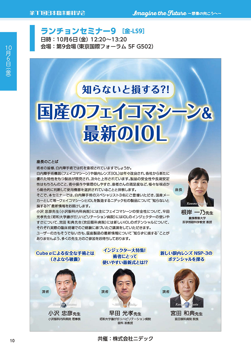 ランチョンセミナー9 知らないと損する?! 国産のフェイコマシーン&最新のIOL 2023年10月6日(金) 12:20 - 13:20 第9会場 | 東京国際フォーラム 5F G502 共催:株式会社ニデック |